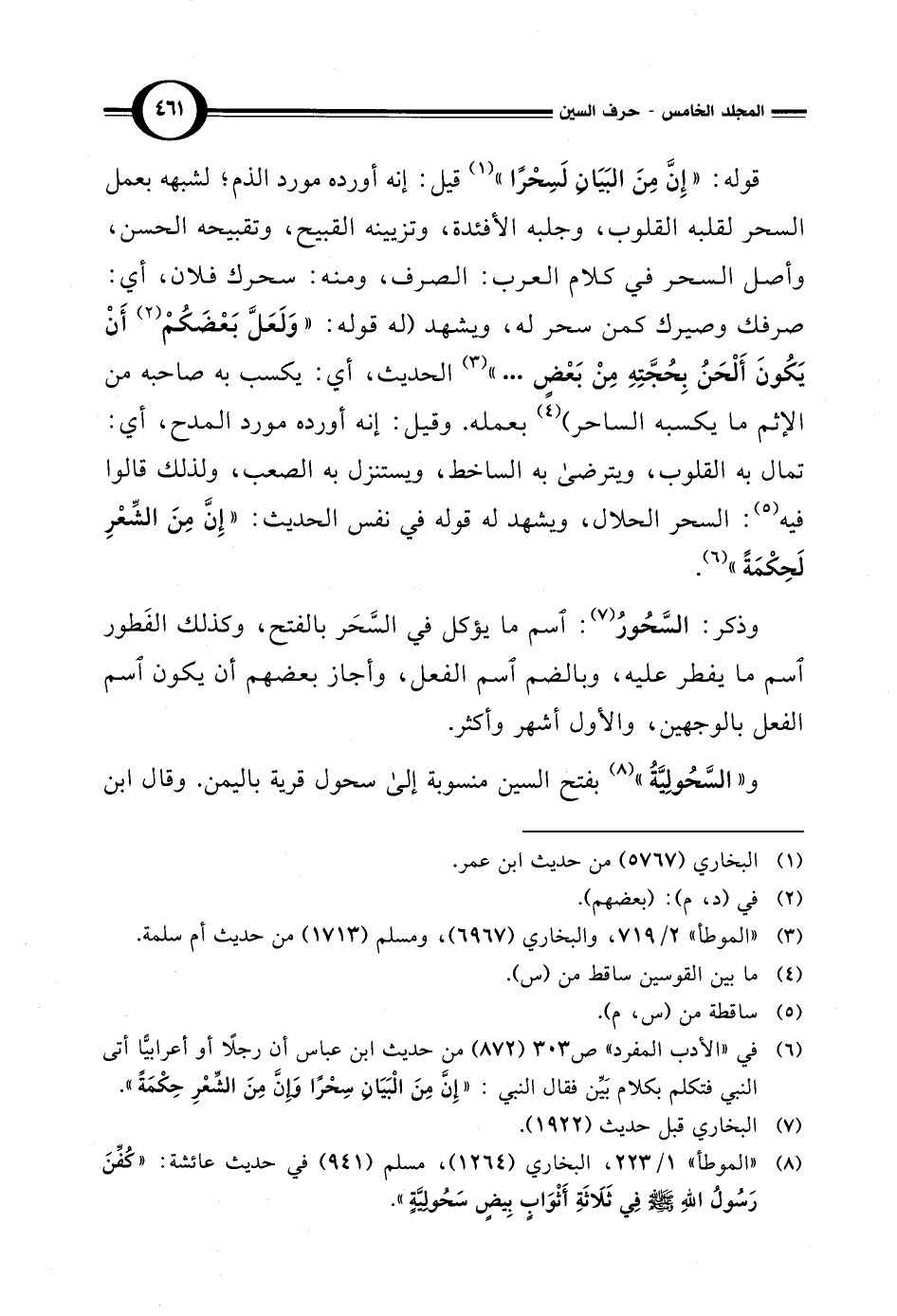 قوله: "إِنَّ مِنَ البَيَانِ لَسِحْرًا" (¬1) قيل: إنه أورده مورد الذم؛ لشبهه بعمل السحر لقلبه القلوب، وجلبه الأفئدة، وتزيينه القبيح، وتقبيحه الحسن، وأصل السحر في كلام العرب: الصرف، ومنه: سحرك فلان، أي: صرفك وصيرك كمن سحر له، ويشهد (له قوله: "وَلَعَلَّ بَعْضَكُمْ (¬2) أَنْ يَكُونَ أَلْحَنُ بِحُجَّتِهِ مِنْ بَعْضٍ ... " (¬3) الحديث، أي: يكسب به صاحبه من الإثم ما يكسبه الساحر) (¬4) بعمله. وقيل: إنه أورده مورد المدح، أي: تمال به القلوب، ويترضى به الساخط، ويستنزل به الصعب، ولذلك قالوا فيه (¬5): السحر الحلال، ويشهد له قوله في نفس الحديث: "إِنَّ مِنَ الشِّعْرِ لَحِكْمَةً" (¬6).
