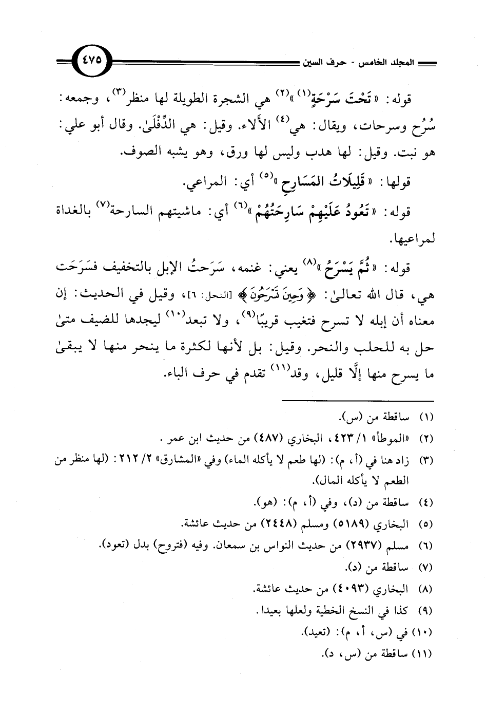 قوله: "ثُمَّ يَسْرَحُ" (¬8) يعني: غنمه، سَرَحتُ الإبل بالتخفيف فسَرَحَت هي، قال الله تعالى: {وَحِينَ تَسْرَحُونَ} [النحل: 6]، وقيل في الحديث: إن معناه أن إبله لا تسرح فتغيب قريبًا (¬9)، ولا تبعد (¬10) ليجدها للضيف متى حل به للحلب والنحر. وقيل: بل لأنها لكثرة ما ينحر منها لا يبقى ما يسرح منها إلَّا قليل، وقد (¬11) تقدم في حرف الباء.