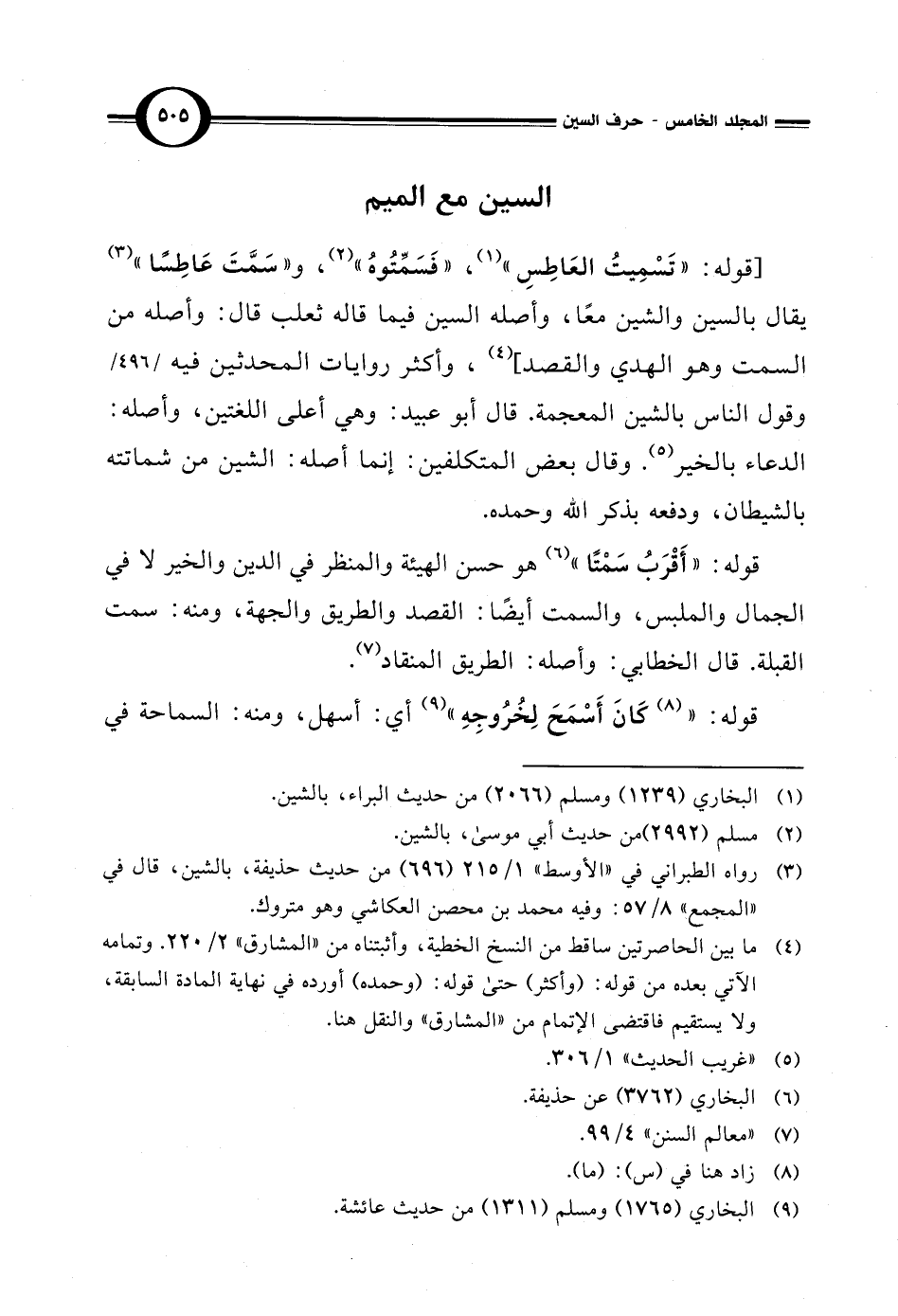 [قوله: "تَسْمِيتُ العَاطِسِ" (¬1)، "فَسَمِّتُوهُ" (¬2)، و"سَمَّتَ عَاطِسًا" (¬3) يقال بالسين والشين معًا، وأصله السين فيما قاله ثعلب قال: وأصله من السمت وهو الهدي والقصد] (¬4)، وأكثر روايات المحدثين فيه وقول الناس بالشين المعجمة. قال أبو عبيد: وهي أعلى اللغتين، وأصله: الدعاء بالخير (¬5). وقال بعض المتكلفين: إنما أصله: الشين من شماتته بالشيطان، ودفعه بذكر الله وحمده.