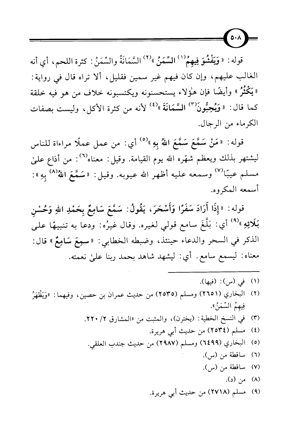 قوله: "وَيَفْشُوَ فِيهِمُ (¬1) السِّمَنُ" (¬2) السَّمَانَةُ والسِّمَنُ: كثرة اللحم، أي أنه الغالب عليهم، وإن كان فيهم غير سمين فقليل، ألا تراه قال في رواية: "يَكْثُرُ" وأيضًا فإن هؤلاء يستحسنونه ويكتسبونه خلاف من هو فيه خلقة كما قال: "وَيُحِبُّونَ (¬3) السَّمَانَةَ" (¬4) لأنه من كثرة الأكل، وليست بصفات الكرماء من الرجال.