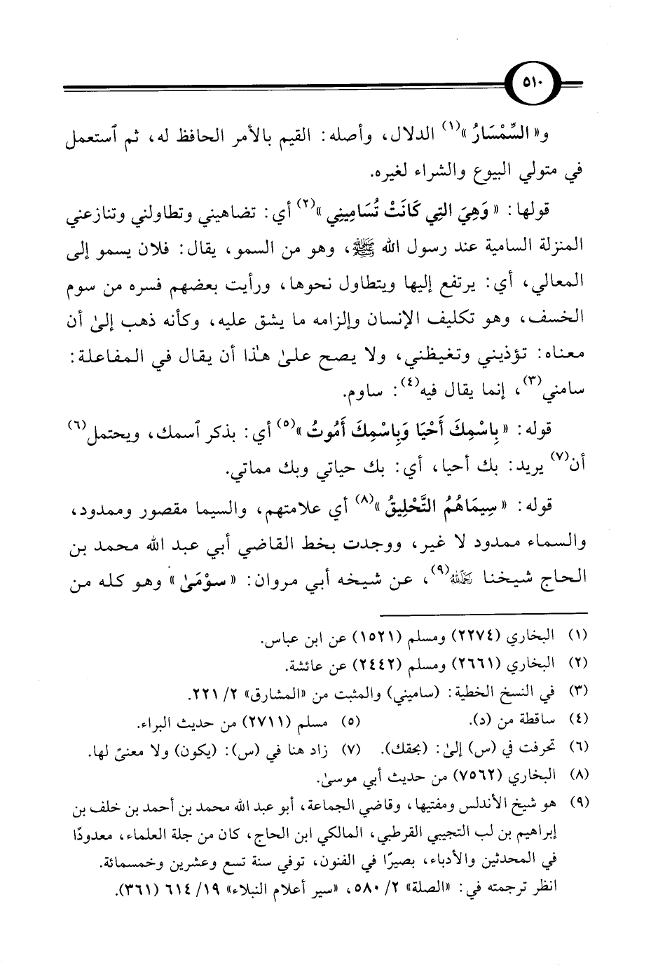 قولها: "وَهِيَ التِي كَانَتْ تُسَامِينِي" (¬2) أي: تضاهيني وتطاولني وتنازعني المنزلة السامية عند رسول الله - صلى الله عليه وسلم -، وهو من السمو، يقال: فلان يسمو إلى المعالي، أي: يرتفع إليها ويتطاول نحوها، ورأيت بعضهم فسره من سوم الخسف، وهو تكليف الإنسان وإلزامه ما يشق عليه، وكأنه ذهب إلى أن معناه: تؤذيني وتغيظني، ولا يصح على هذا أن يقال في المفاعلة: سامني (¬3)، إنما يقال فيه (¬4): ساوم.