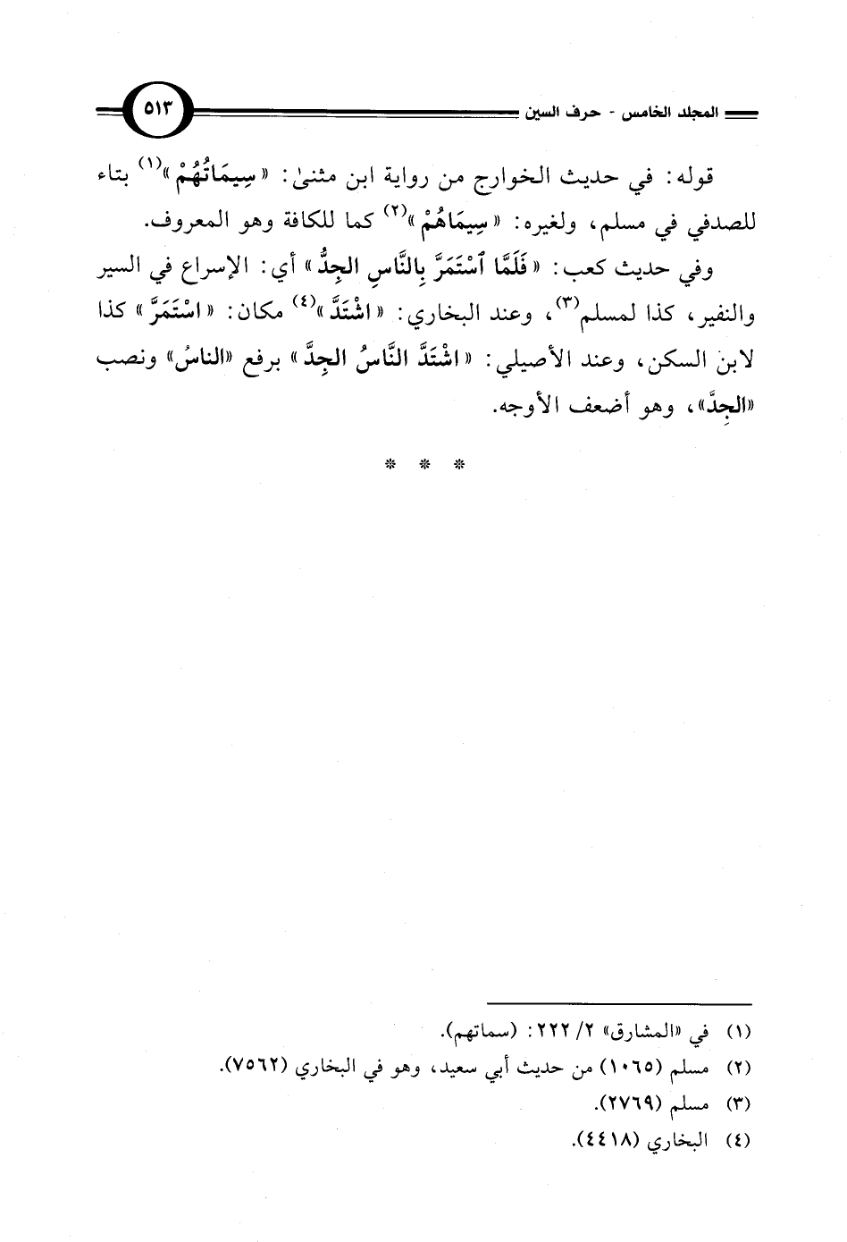 قوله: في حديث الخوارج من رواية ابن مثنى: "سِيمَاتُهُمْ" (¬1) بتاء للصدفي في مسلم، ولغيره: "سِيمَاهُمْ" (¬2) كما للكافة وهو المعروف.