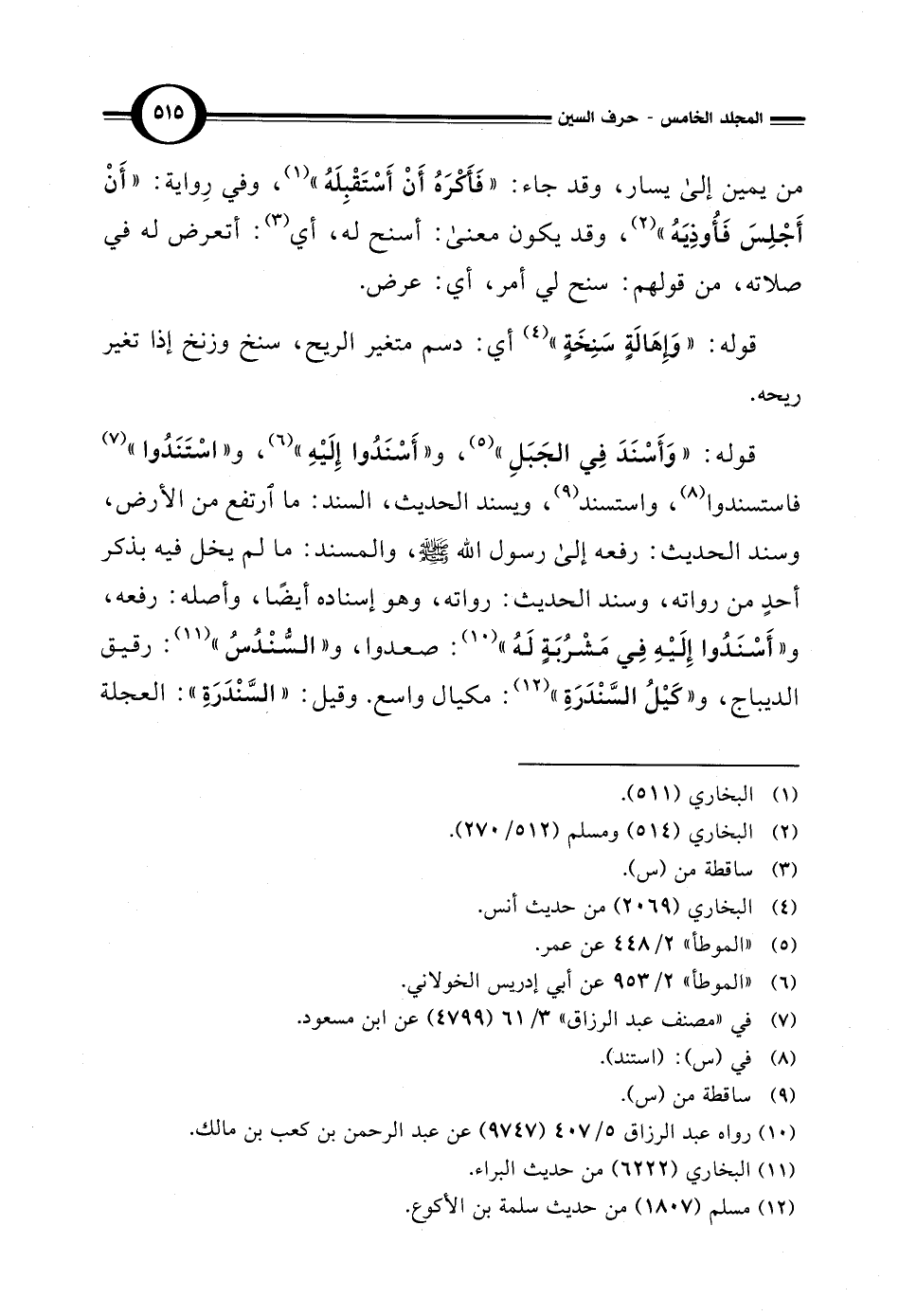 قوله: "وَأَسْنَدَ في الجَبَلِ" (¬5)، و"أَسْنَدُوا إِلَيْهِ" (¬6)، و"اسْتَنَدُوا" (¬7) فاستسندوا (¬8)، واستسند (¬9)، ويسند الحديث، السند: ما ارتفع من الأرض، وسند الحديث: رفعه إلى رسول الله - صلى الله عليه وسلم -، والمسند: ما لم يخل فيه بذكر أحدٍ من رواته، وسند الحديث: رواته، وهو إسناده أيضًا، وأصله: رفعه، و"أَسْنَدُوا إِلَيْهِ في مَشْرُبَةٍ لَهُ" (¬10): صعدوا، و"السُّنْدُسُ" (¬11): رقيق الديباج، و"كَيْلُ السَّنْدَرَةِ" (¬12): مكيال واسع. وقيل: "السَّنْدَرَةِ": العجلة