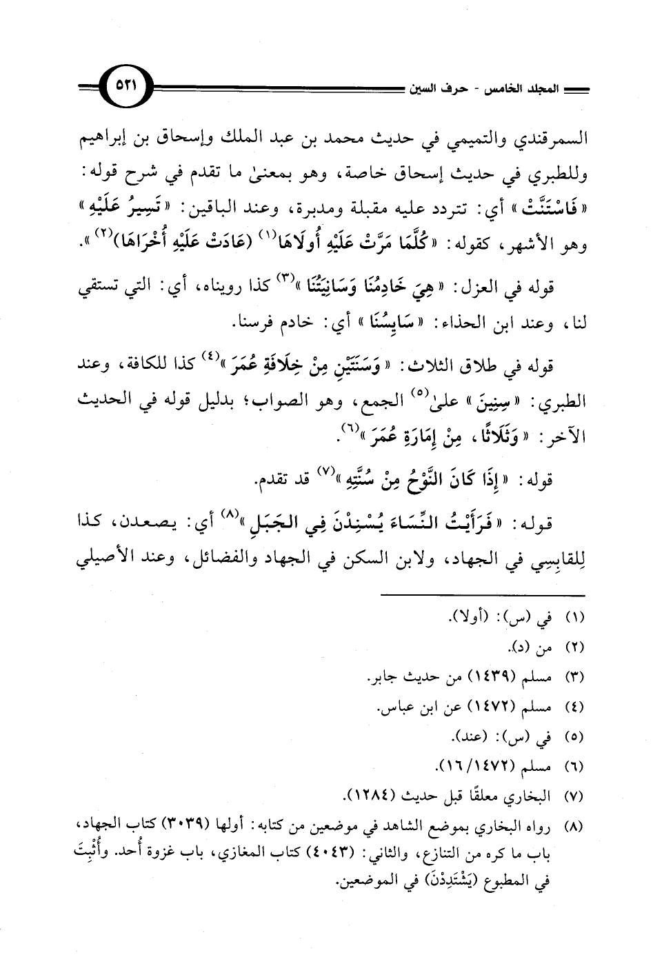 (¬8) رواه البخاري بموضع الشاهد في موضعين من كتابه: أولها (3039) كتاب الجهاد، باب ما كره من التنازِع، والثاني: (4043) كتاب المغازي، باب غزوة أُحد. وأُثْبِتَ في المطبوع (يَشْتَدِدْن) في الموضعين.