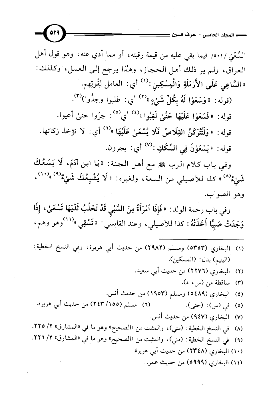 السَّعْيَ فيما بقي عليه من قيمة رقبته، أو مما أدي عنه، وهو قول أهل العراق، ولم ير ذلك أهل الحجاز، وهذا يرجع إلى العمل، وكذلك: "السَّاعِي عَلَى الأَرْمَلَةِ وَالْمِسْكِينِ" (¬1) أي: العامل لِقُوتِهم.
