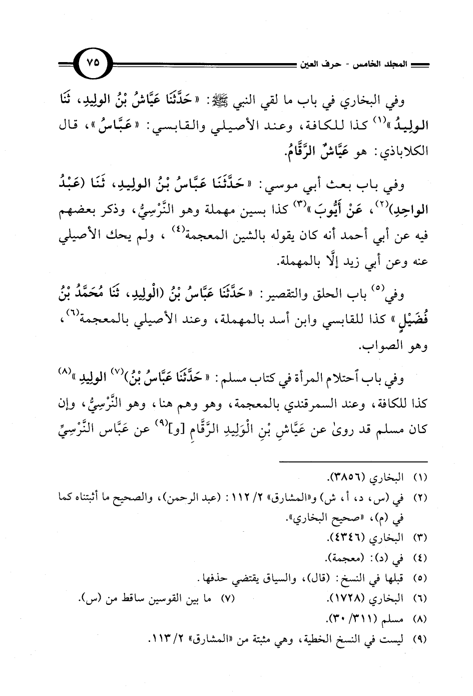 وفي البخاري في باب ما لقي النبي - صلى الله عليه وسلم -: "حَدَّثنَا عَيَّاشُ بْنُ الولِيدِ، ثنَا الولِيدُ" (¬1) كذا للكافة، وعند الأصيلي والقابسي: "عَبَّاسُ"، قال الكلاباذي: هو عَيَّاشٌ الرَّقَّامُ.
