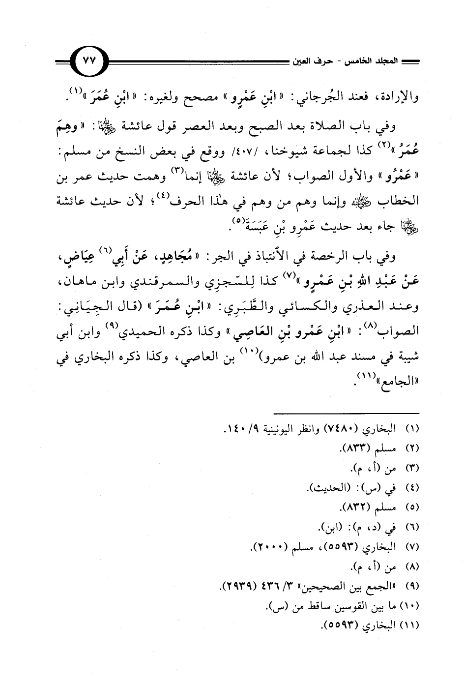 والإرادة، فعند الجُرجاني: "ابْنِ عَمْرٍو" مصحح ولغيره: "ابْنِ عُمَرَ" (¬1).