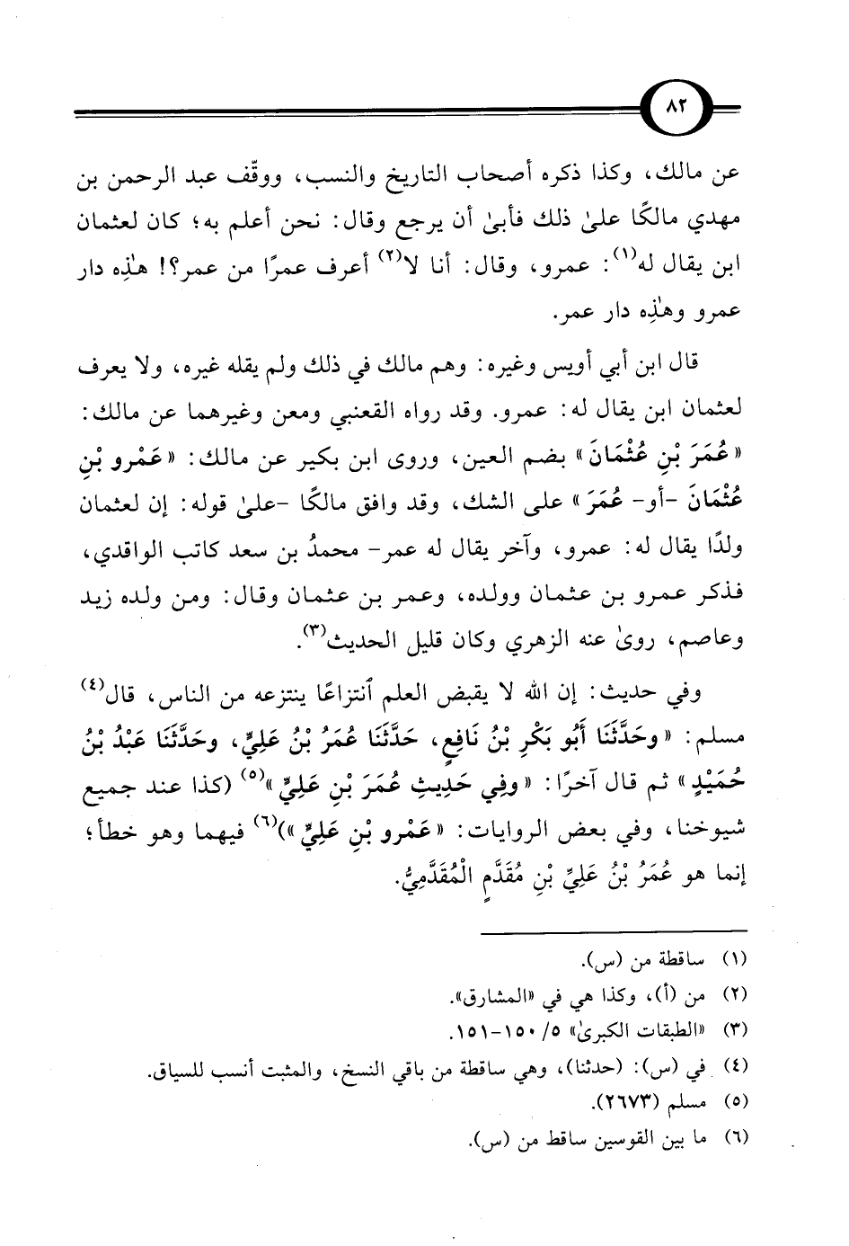 عن مالك، وكذا ذكره أصحاب التاريخ والنسب، ووقّف عبد الرحمن بن مهدي مالكًا على ذلك فأبى أن يرجع وقال: نحن أعلم به؛ كان لعثمان ابن يقال له (¬1): عمرو، وقال: أنا لا (¬2) أعرف عمرًا من عمر؟! هذِه دار عمرو وهذِه دار عمر.