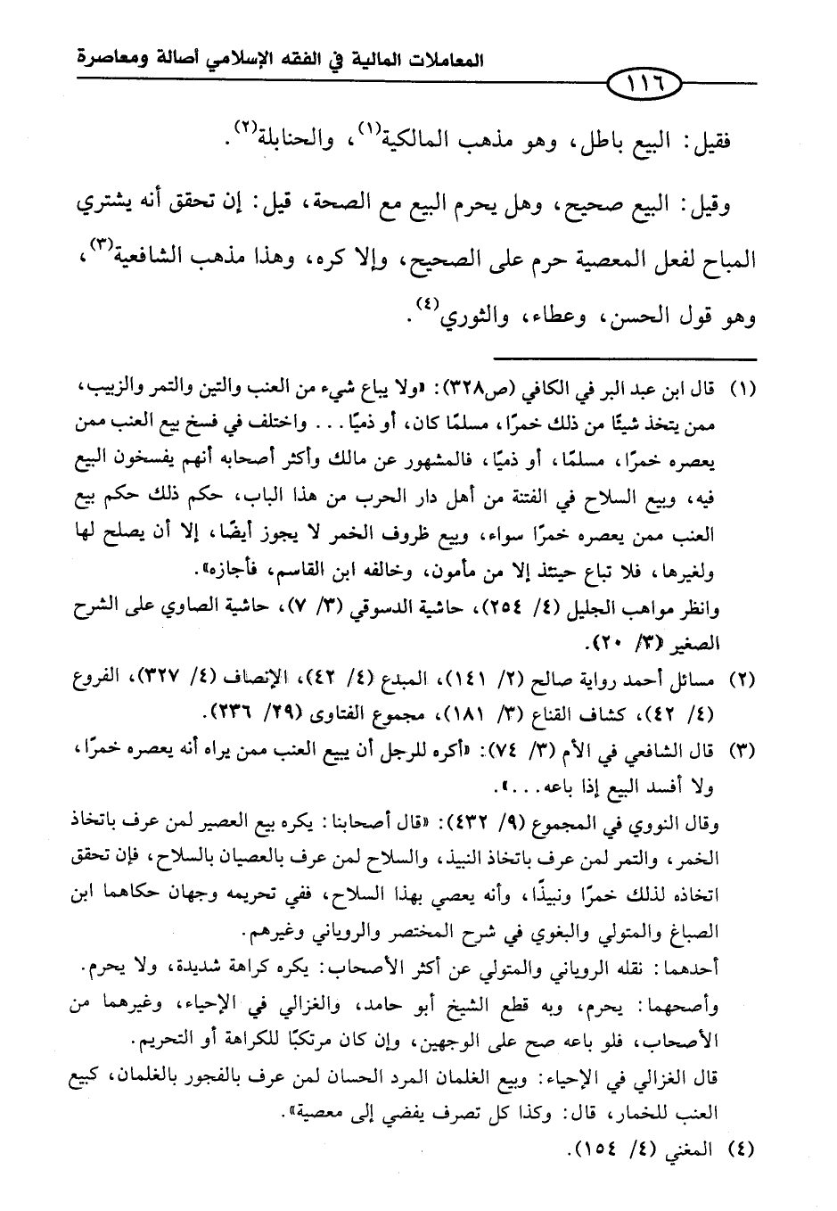 (¬١) قال ابن عبد البر في الكافي (ص ٣٢٨): "ولا يباع شيء من العنب والتين والتمر والزبيب، ممن يتخذ شيئًا من ذلك خمرًا، مسلمًا كان، أو ذميًا ... واختلف في فسخ بيع العنب ممن يعصره خمرًا، مسلمًا، أو ذميا، فالمشهور عن مالك وأكثر أصحابه أنهم يفسخون البيع فيه، وبيع السلاح في الفتنة من أهل دار الحرب من هذا الباب، حكم ذلك حكم بيع العنب ممن يعصره خمرًا سواء، وييع ظروف الخمر لا يجوز أيضاً، إلا أن يصلح لها ولغيرها، فلا تباع حينئذ إلا من مأمون، وخالفه ابن القاسم، فأجازه".