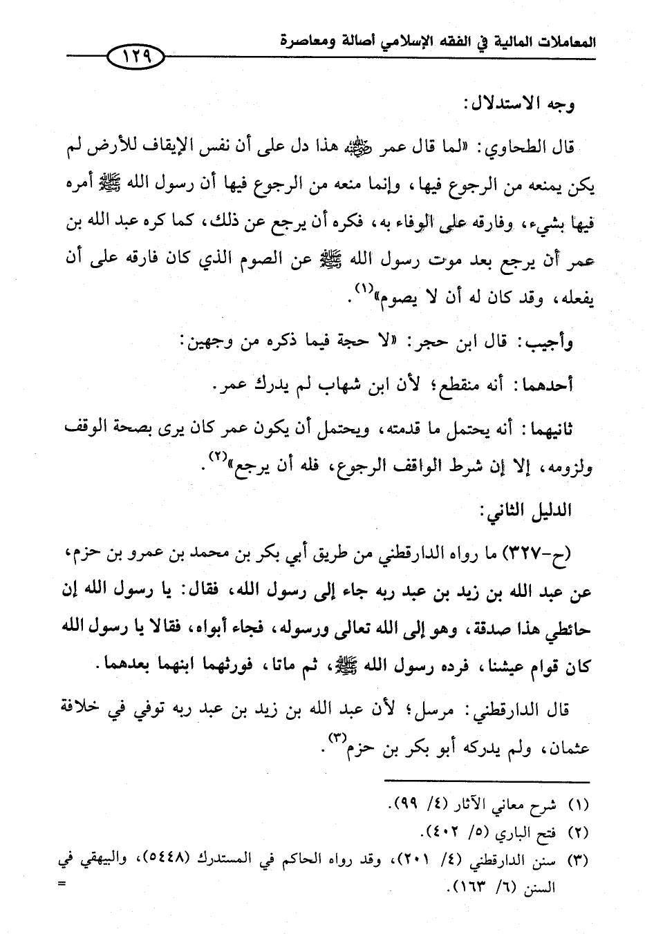 قال الطحاوي: "لما قال عمر - رضي الله عنه - هذا دل على أن نفس الإيقاف للأرض لم يكن يمنعه من الرجوع فيها، وإنما منعه من الرجوع فيها أن رسول الله - صلى الله عليه وسلم - أمره فيها بشيء، وفارقه على الوفاء به، فكره أن يرجع عن ذلك، كما كره عبد الله بن عمر أن يرجع بعد موت رسول الله - صلى الله عليه وسلم - عن الصوم الذي كان فارقه على أن يفعله، وقد كان له أن لا يصوم" (¬١).