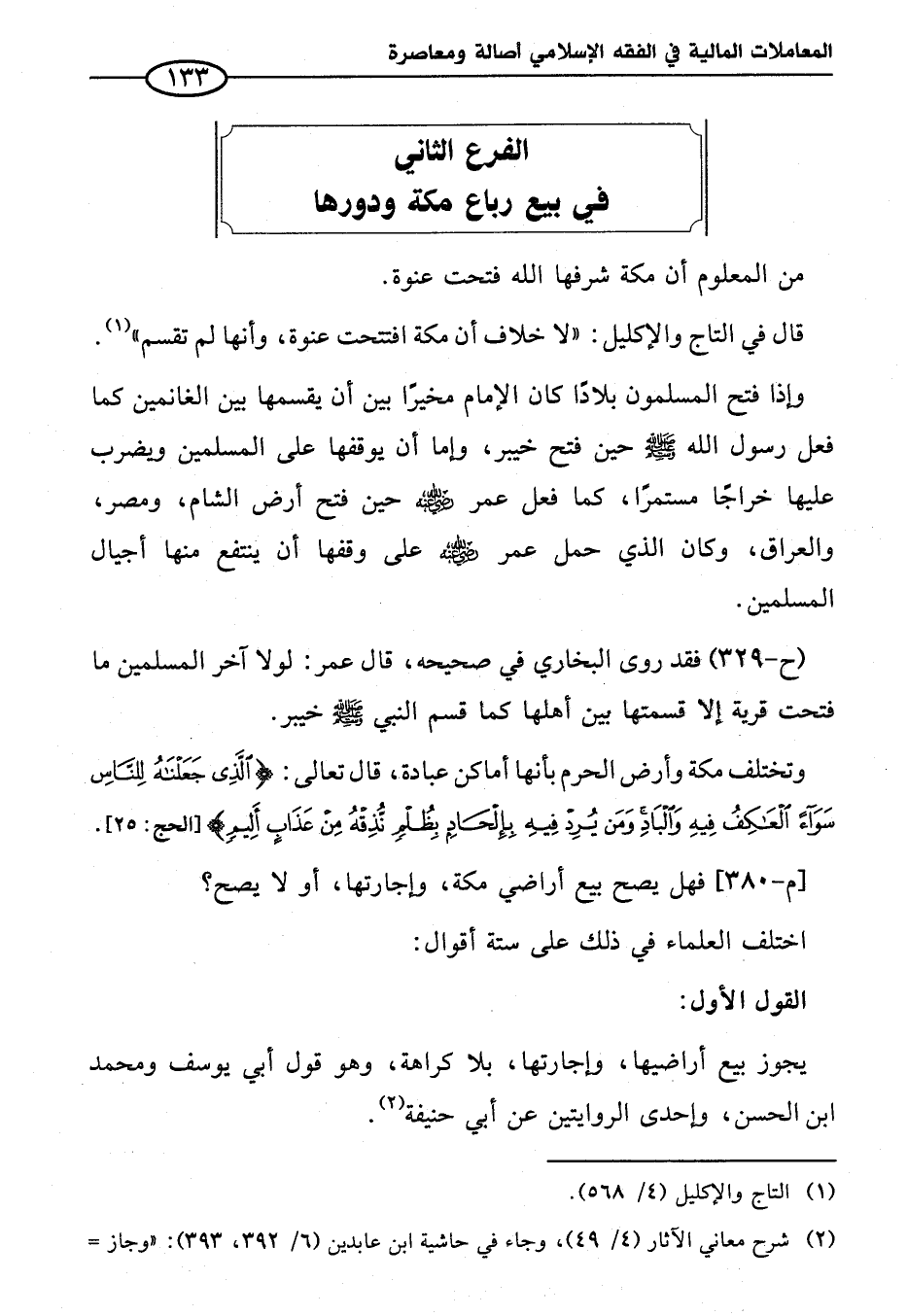 الفرع الثاني في بيع رباع مكة ودورها
