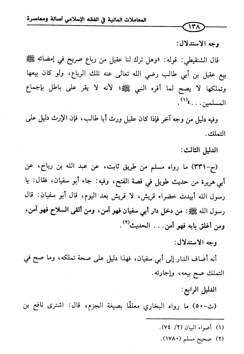 قال الشنقيطي: قوله: "وهل ترك لنا عقيل من رباع صريح في إمضائه - صلى الله عليه وسلم - بيع عقيل بن أبي طالب رضي الله تعالى عنه تلك الرباع، ولو كان بيعها وتملكها لا يصح لما أقره النبي - صلى الله عليه وسلم - لأنه لا يقر على باطل بإجماع المسلمين ... " (¬١).