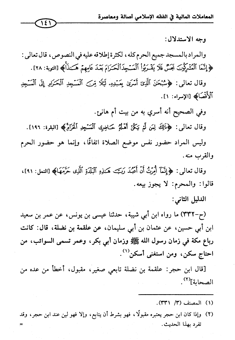 (ح-٣٣٢) ما رواه ابن أبي شيبة، حدثنا عيسى بن يونس، عن عمر بن سعيد ابن أبي حسين، عن عثمان بن أبي سليمان، عن علقمة بن نضلة، قال: كانت رباع مكة في زمان رسول الله - صلى الله عليه وسلم - زمان أبي بكر، وعمر تسمى السوائب، من احتاج سكن، ومن استغنى أسكن (¬١).