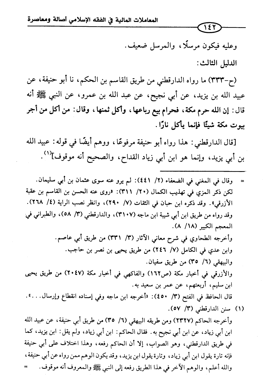 (ح-٣٣٣) ما رواه الدارقطني من طريق القاسم بن الحكم، نا أبو حنيفة، عن عبيد الله بن يزيد، عن أبي نجيح، عن عبد الله بن عمرو، عن النبي - صلى الله عليه وسلم - أنه قال: إن الله حرم مكة، فحرام بيع رباعها، وأكل ثمنها، وقال: من أكل من أجر بيوت مكة شيئًا فإنما يأكل نارًا.