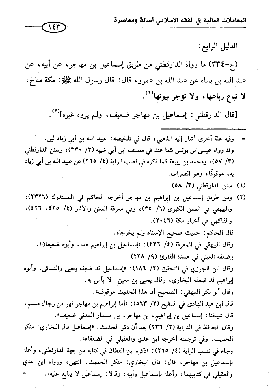 (ح-٣٣٤) ما رواه الدارقطني من طريق إسماعيل بن مهاجر، عن أبيه، عن عبد الله بن باباه عن عبد الله بن عمرو، قال: قال رسول الله - صلى الله عليه وسلم -: مكة مناخ، لا تباع رباعها, ولا تؤجر بيوتها (¬١).