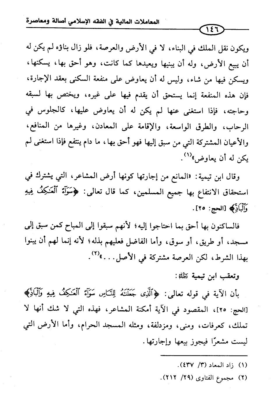 وقال ابن تيمية: "المانع من إجارتها كونها أرض المشاعر، التي يشترك في استحقاق الانتفاع بها جميع المسلمين، كما قال تعالى: {سَوَاءً الْعَاكِفُ فِيهِ وَالْبَادِ} [الحج: ٢٥].