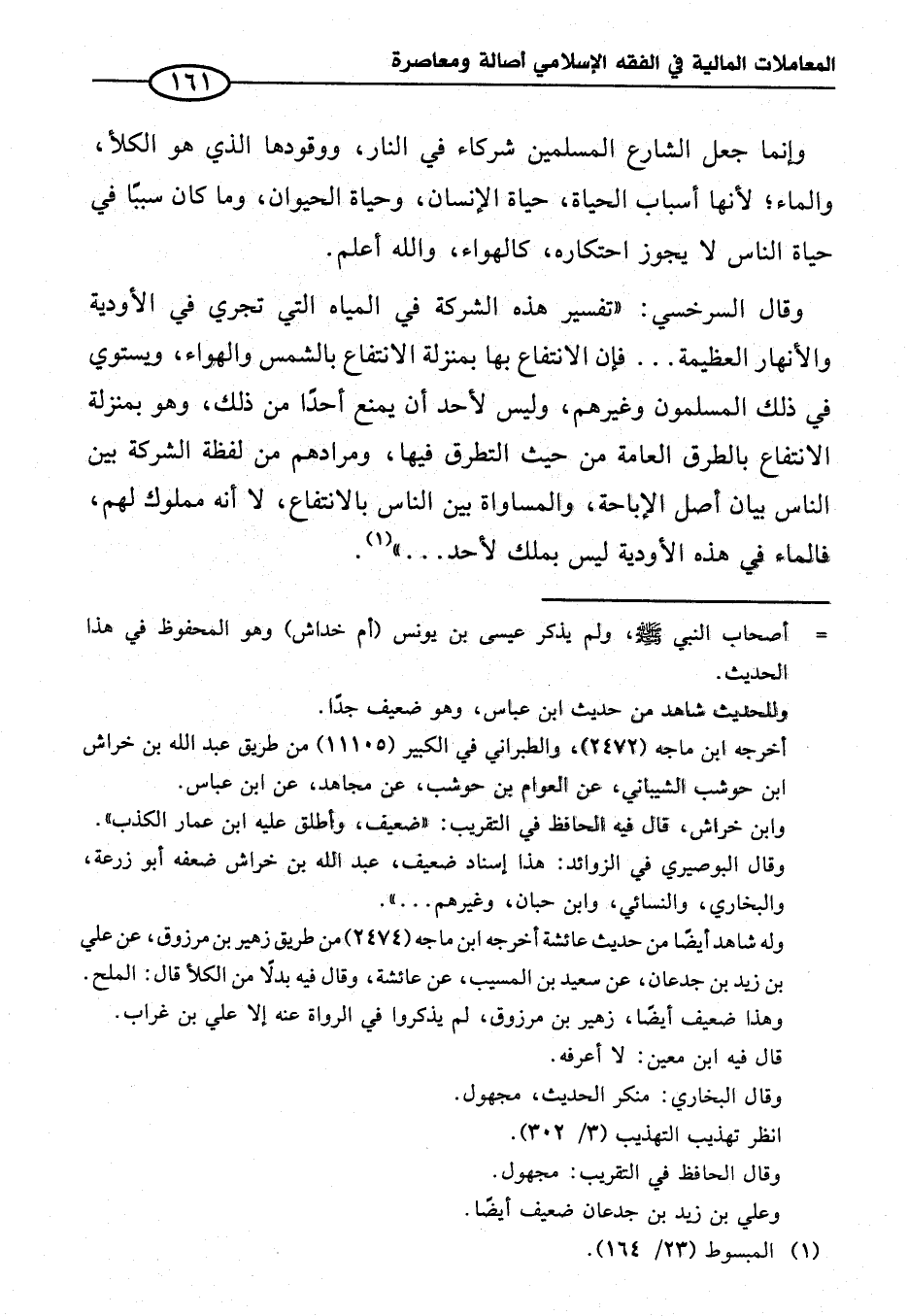 وقال السرخسي: "تفسير هذه الشركة في المياه التي تجري في الأودية والأنهار العظيمة ... فإن الانتفاع بها بمنزلة الانتفاع بالشمس والهواء، ويستوي في ذلك المسلمون وغيرهم، وليس لأحد أن يمنع أحدًا من ذلك، وهو بمنزلة الانتفاع بالطرق العامة من حيث التطرق فيها، ومرادهم من لفظة الشركة بين الناس بيان أصل الإباحة، والمساواة بين الناس بالانتفاع، لا أنه مملوك لهم، فالماء في هذه الأودية ليس بملك لأحد ... " (¬١).