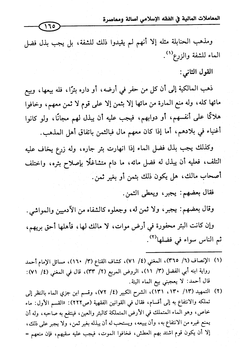 (¬٢) التمهيد (١٣/ ١٣٠، ١٣١)، الشرح الكبير (٤/ ٧٢)، وقسم ابن جزي الماء بالنظر إلى تملكه والانتفاع به إلى أقسام، فقال في القوانين الفقهية (ص ٢٢٢): "القسم الأول: ماء خاص، وهو الماء المتملك في الأرض المتملكة كالبئر والعين، فينتفع به صاحبه، وله أن يمنع غيره من الانتفاع به، وأن يبيعه، ويستحب له أن يبذله بغير ثمن، ولا يجبر على ذلك، إلا أن يكون قوم اشتد بهم العطش، فخافوا الموت، فيجب عليه سقيهم، فإن منعهم =