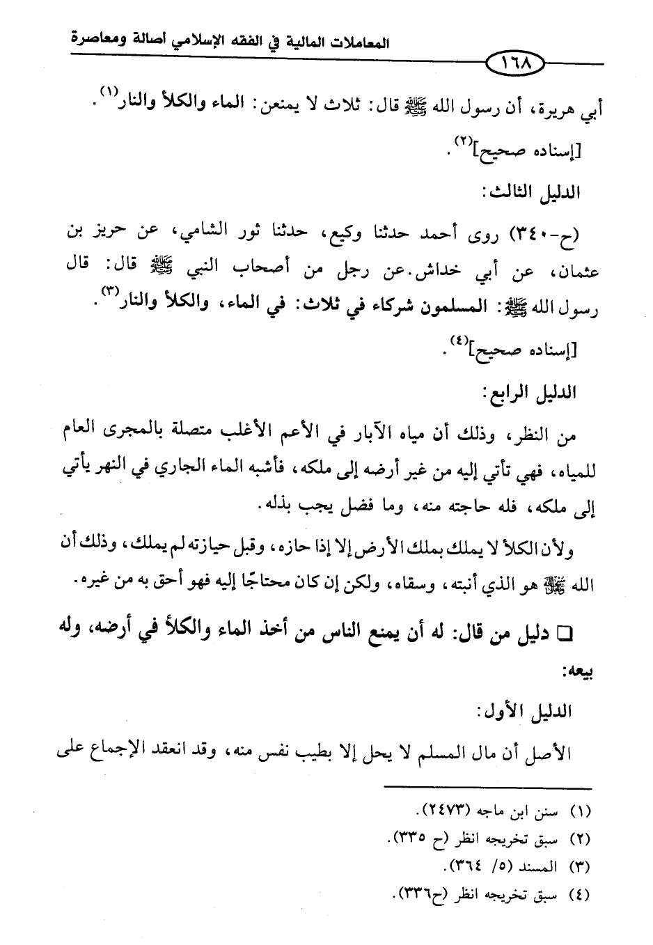 أبي هريرة، أن رسول الله - صلى الله عليه وسلم - قال: ثلاث لا يمنعن: الماء والكلأ والنار (¬١).