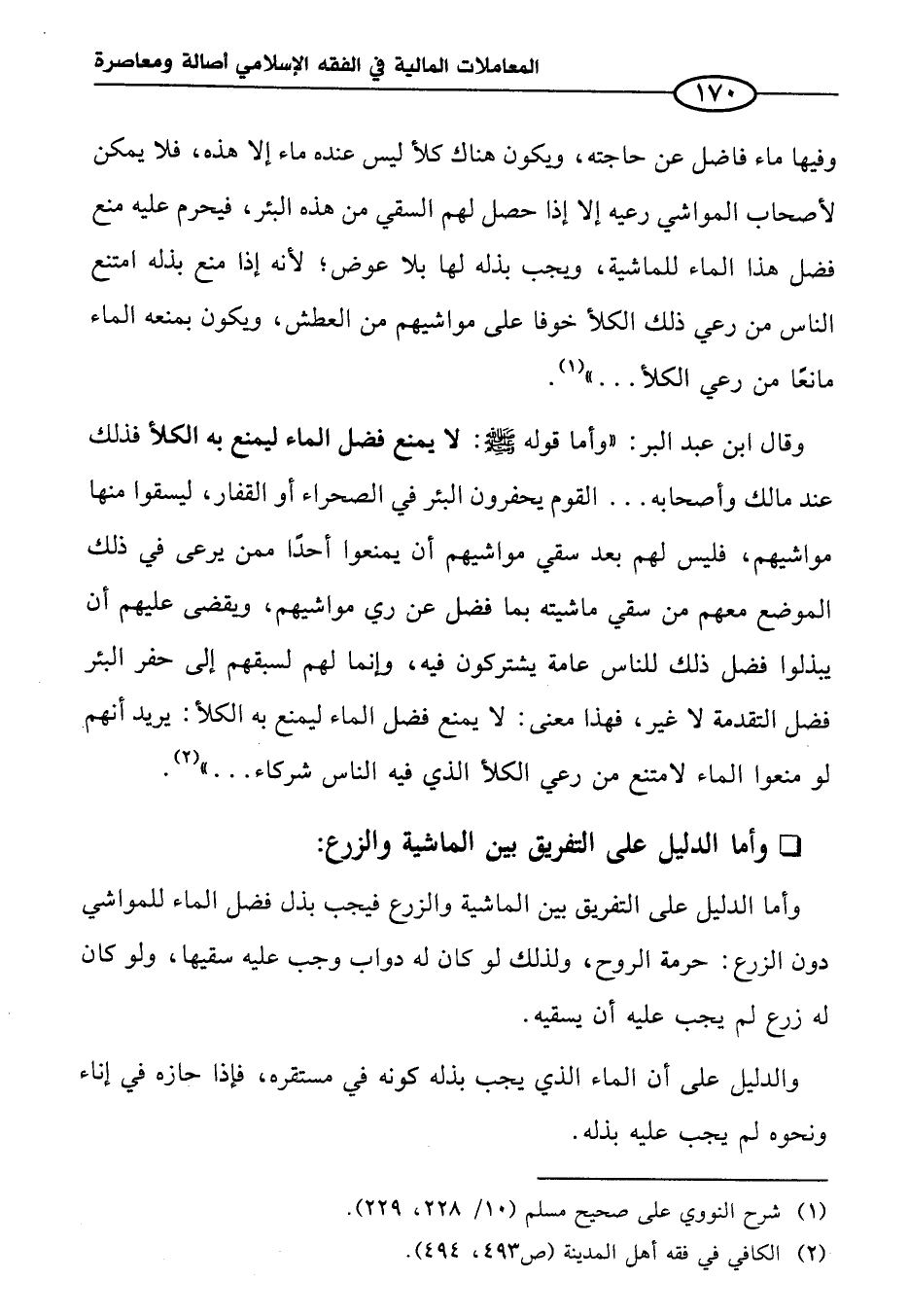 وأما الدليل على التفريق بين الماشية والزرع فيجب بذل فضل الماء للمواشي دون الزرع: حرمة الروح، ولذلك لو كان له دواب وجب عليه سقيها، ولو كان له زرع لم يجب عليه أن يسقيه.