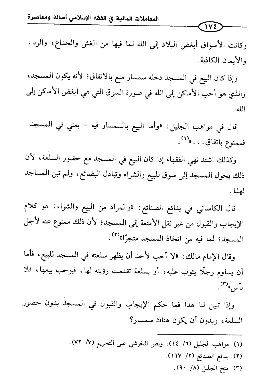 وقال الإِمام مالك: "لا أحب لأحد أن يظهر سلعته في المسجد للبيع، فأما أن يساوم رجلاً بثوب عليه، أو بسلعة تقدمت رؤيته لها، فيوجب بيعها، فلا بأس" (¬٣).