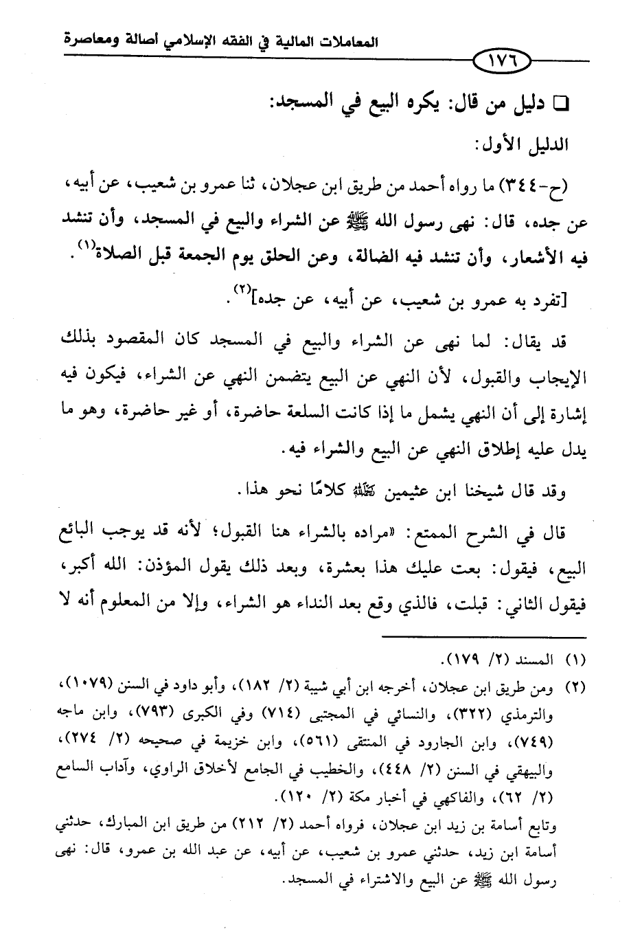 (ح-٣٤٤) ما رواه أحمد من طريق ابن عجلان، ثنا عمرو بن شعيب، عن أبيه، عن جده، قال: نهى رسول الله - صلى الله عليه وسلم - عن الشراء والبيع في المسجد، وأن تنشد فيه الأشعار، وأن تنشد فيه الضالة، وعن الحلق يوم الجمعة قبل الصلاة (¬١).
