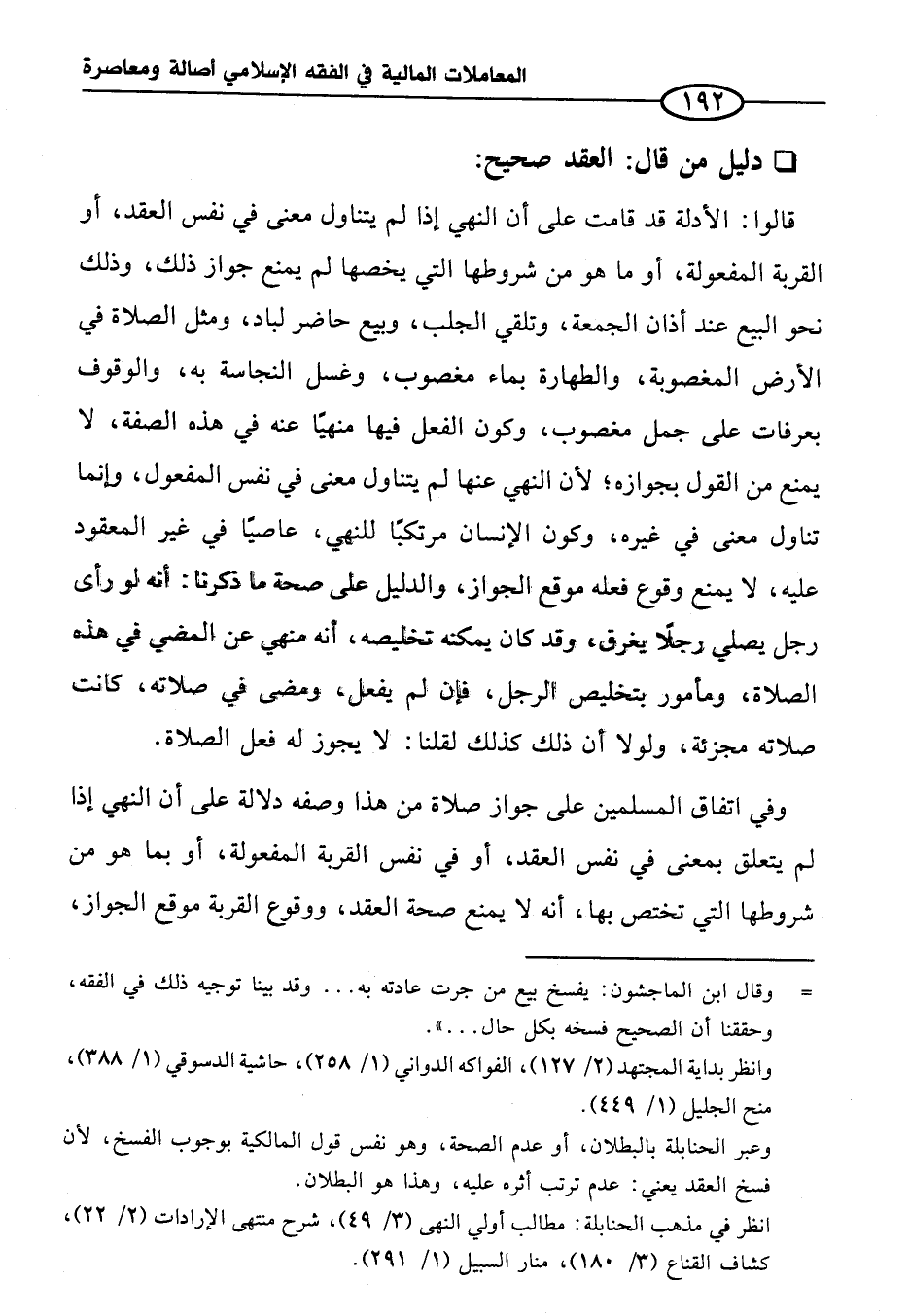 قالوا: الأدلة قد قامت على أن النهي إذا لم يتناول معنى في نفس العقد، أو القربة المفعولة، أو ما هو من شروطها التي يخصها لم يمنع جواز ذلك، وذلك نحو البيع عند أذان الجمعة، وتلقي الجلب، وبيع حاضر لباد، ومثل الصلاة في الأرض المغصوبة، والطهارة بماء مغصوب، وغسل النجاسة به، والوقوف بعرفات على جمل مغصوب، وكون الفعل فيها منهيًا عنه في هذه الصفة، لا يمنع من القول بجوازه؛ لأن النهي عنها لم يتناول معنى في نفس المفعول، وإنما تناول معنى في غيره، وكون الإنسان مرتكبًا للنهي، عاصيًا في غير المعقود عليه، لا يمنع وقوع فعله موقع الجواز، والدليل على صحة ما ذكرنا: أنه لو رأى رجل يصلي رجلًا يغرق، وقد كان يمكنه خليصه، أنه منهي عن المضي في هذه الصلاة، ومأمور بتخليص الرجل، فإن لم يفعل، ومضى في صلاته، كانت صلاته مجزئة، ولولا أن ذلك كذلك لقلنا: لا يجوز له فعل الصلاة.