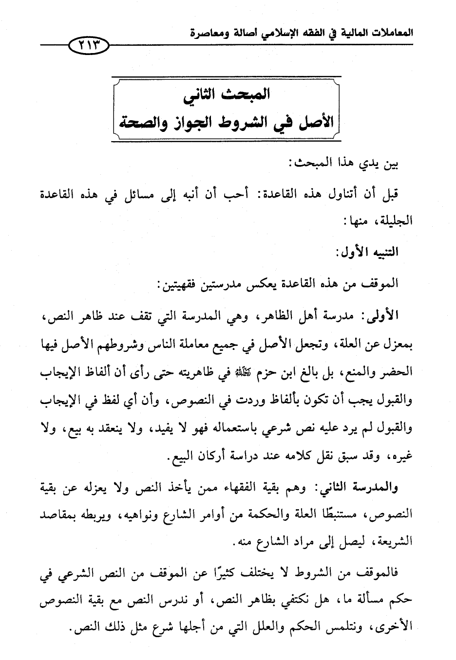 الأولى: مدرسة أهل الظاهر، وهي المدرسة التي تقف عند ظاهر النص، بمعزل عن العلة، وتجعل الأصل في جميع معاملة الناس وشروطهم الأصل فيها الحضر والمنع، بل بالغ ابن حزم - رحمه الله - في ظاهريته حتى رأى أن ألفاظ الإيجاب والقبول يجب أن تكون بألفاظ وردت في النصوص، وأن أي لفظ في الإيجاب والقبول لم يرد عليه نص شرعي باستعماله فهو لا يفيد، ولا ينعقد به بيع، ولا غيره، وقد سبق نقل كلامه عند دراسة أركان البيع.