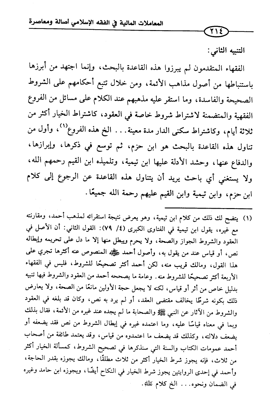 (¬١) يتضح لك ذلك من كلام ابن تيمية، وهو يعرض نتيجة استقرائه لمذهب أحمد، ومقارنته مع غيره، يقول ابن تيمية في الفتاوى الكبرى (٤/ ٧٩): القول الثاني: أن الأصل في العقود والشروط الجواز والصحة، ولا يحرم ويبطل منها إلا ما دل على تحريمه وإبطاله نص، أو قياس عند من يقول به، وأصول أحمد - رضي الله عنه - المنصوص عنه أكثرها تجري على هذا القول، ومالك قريب منه، لكن أحمد أكثر تصحيحًا للشروط، فليس في الفقهاء الأربعة أكثر تصحيحًا للشروط منه. وعامة ما يصححه أحمد من العقود والشروط فيها تنبيه بدليل خاص من أثر أو قياس، لكنه لا يجعل حجة الأولين مانعًا من الصحة، ولا يعارض ذلك بكونه شرطًا يخالف مقتضى العقد، أو لم يرد به نص، وكان قد بلغه في العقود والشروط من الآثار عن النبي - صلى الله عليه وسلم - والصحابة ما لم يجده عند غيره من الأئمة، فقال بذلك وبما في معناه قياسًا عليه، وما اعتمده غيره في إبطال الشروط من نص فقد يضعفه أو يضعف دلالته، وكذلك قد يضعف ما اعتمدوه من قياس، وقد يعتمد طائفة من أصحاب أحمد عمومات الكتاب والسنة التي سنذكرها في تصحيح الشروط، كمسألة الخيار أكثر من ثلاث، فإنه يجوز شرط الخيار أكثر من ثلاث مطلقًا، ومالك يجوزه بقدر الحاجة، وأحمد في إحدى الروايتين يجوز شرط الخيار في النكاح أيضًا، ويجوزه ابن حامد وغيره في الضمان ونحوه ... الخ كلام - رحمه الله -.