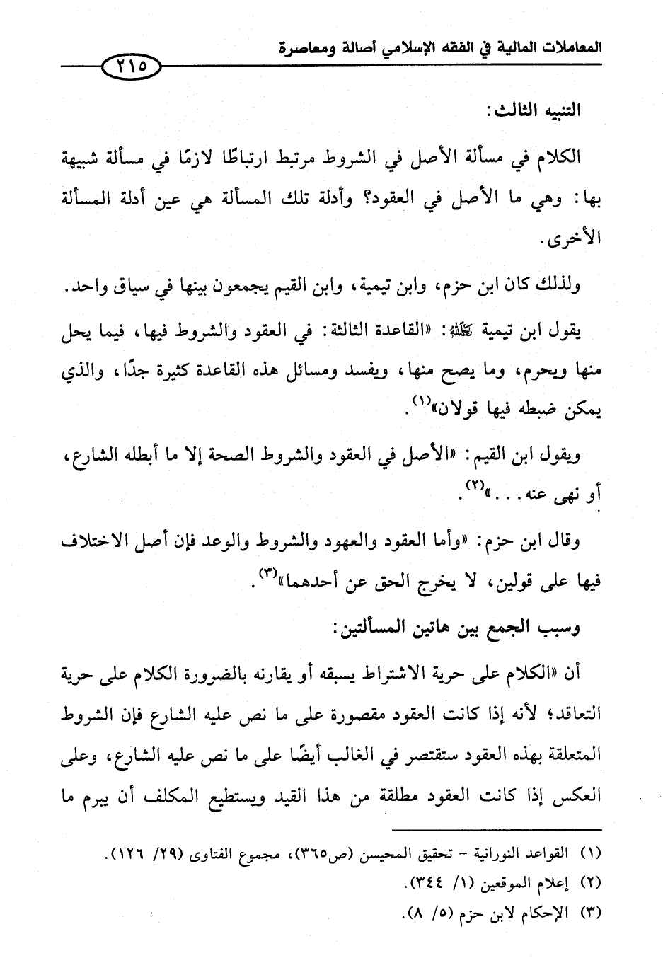يقول ابن تيمية - رحمهُ الله -: "القاعدة الثالثة: في العقود والشروط فيها، فيما يحل منها ويحرم، وما يصح منها، ويفسد ومسائل هذه القاعدة كثيرة جدًا، والذي يمكن ضبطه فيها قولان" (¬١).