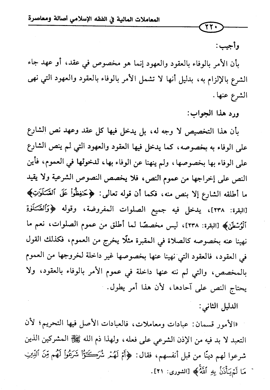 بأن هذا التخصيص لا وجه له، بل يدخل فيها كل عقد وعهد نص الشارع على الوفاء به بخصوصه، كما يدخل فيها العقود والعهود التي لم ينص الشارع على الوفاء بها بخصوصها، ولم ينهنا عن الوفاء بها، لدخولها في العموم، فأين النص على إخراجها من عموم النص، فلا يخصص النصوص الشرعية ولا يقيد ما أطلقه الشارع إلا بنص منه، فكما أن قوله تعالى: {حَافِظُوا عَلَى الصَّلَوَاتِ} [البقرة: ٢٣٨]، يدخل فيه جميع الصلوات المفروضة، وقوله {وَالصَّلَاةِ الْوُسْطَى} [البقرة: ٢٣٨]، ليس مخصصًا لما أطلق من عموم الصلوات، نعم ما نهينا عنه بخصوصه كالصلاة في المقبرة مثلًا يخرج من العموم، فكذلك القول في العقود، فالعقود التي نهينا عنها بخصوصها غير داخلة لخروجها من العموم بالمخصص، والتي لم ننه عنها داخلة في عموم الأمر بالوفاء بالعقود، ولا يحتاج النص على آحادها، لأن هذا أمر يطول.