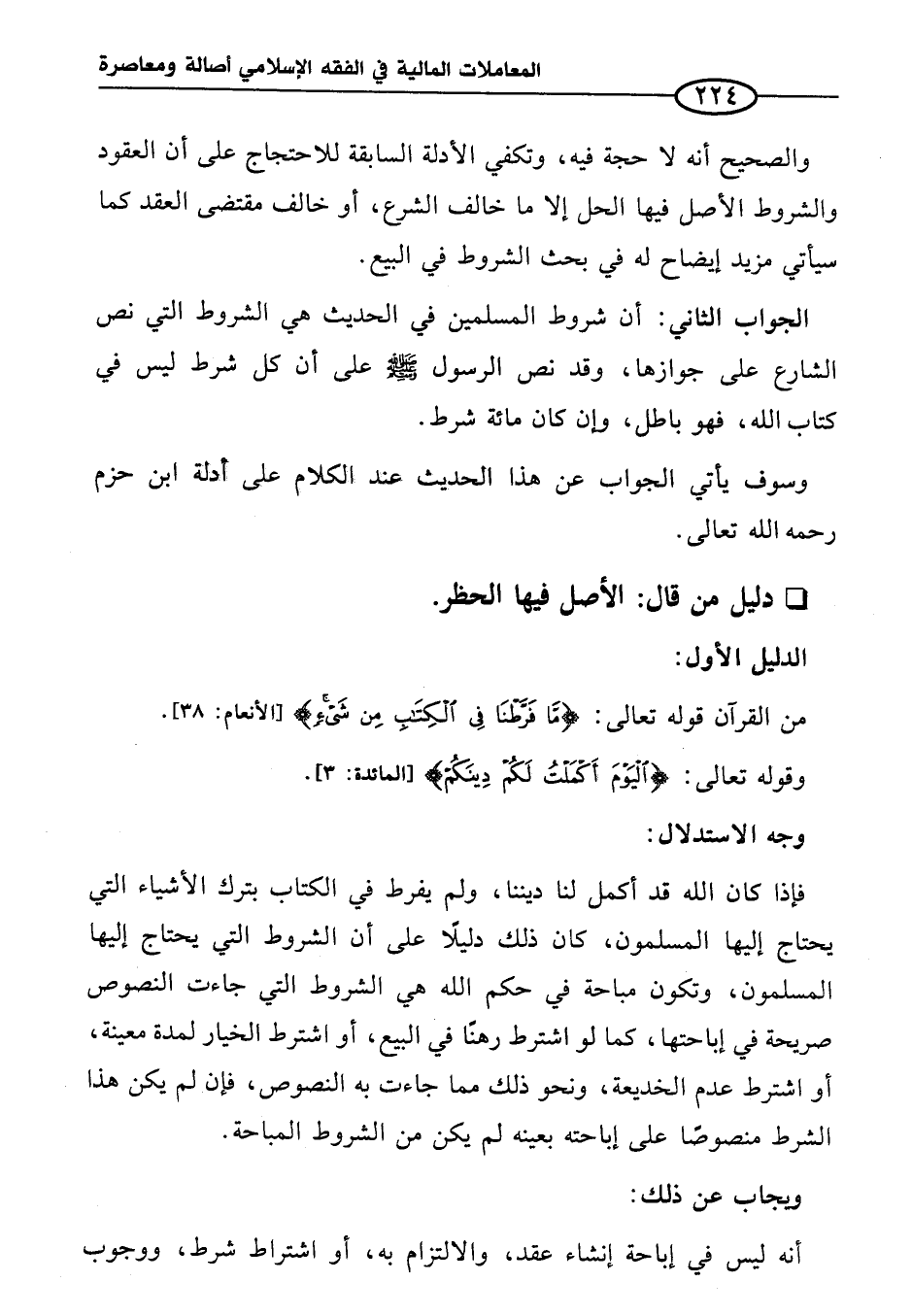 فإذا كان الله قد أكمل لنا ديننا، ولم يفرط في الكتاب بترك الأشياء التي يحتاج إليها المسلمون، كان ذلك دليلًا على أن الشروط التي يحتاج إليها المسلمون، وتكون مباحة في حكم الله هي الشروط التي جاءت النصوص صريحة في إباحتها، كما لو اشترط رهنًا في البيع، أو اشترط الخيار لمدة معينة، أو اشترط عدم الخديعة، ونحو ذلك مما جاءت به النصوص، فإن لم يكن هذا الشرط منصوصًا على إباحته بعينه لم يكن من الشروط المباحة.