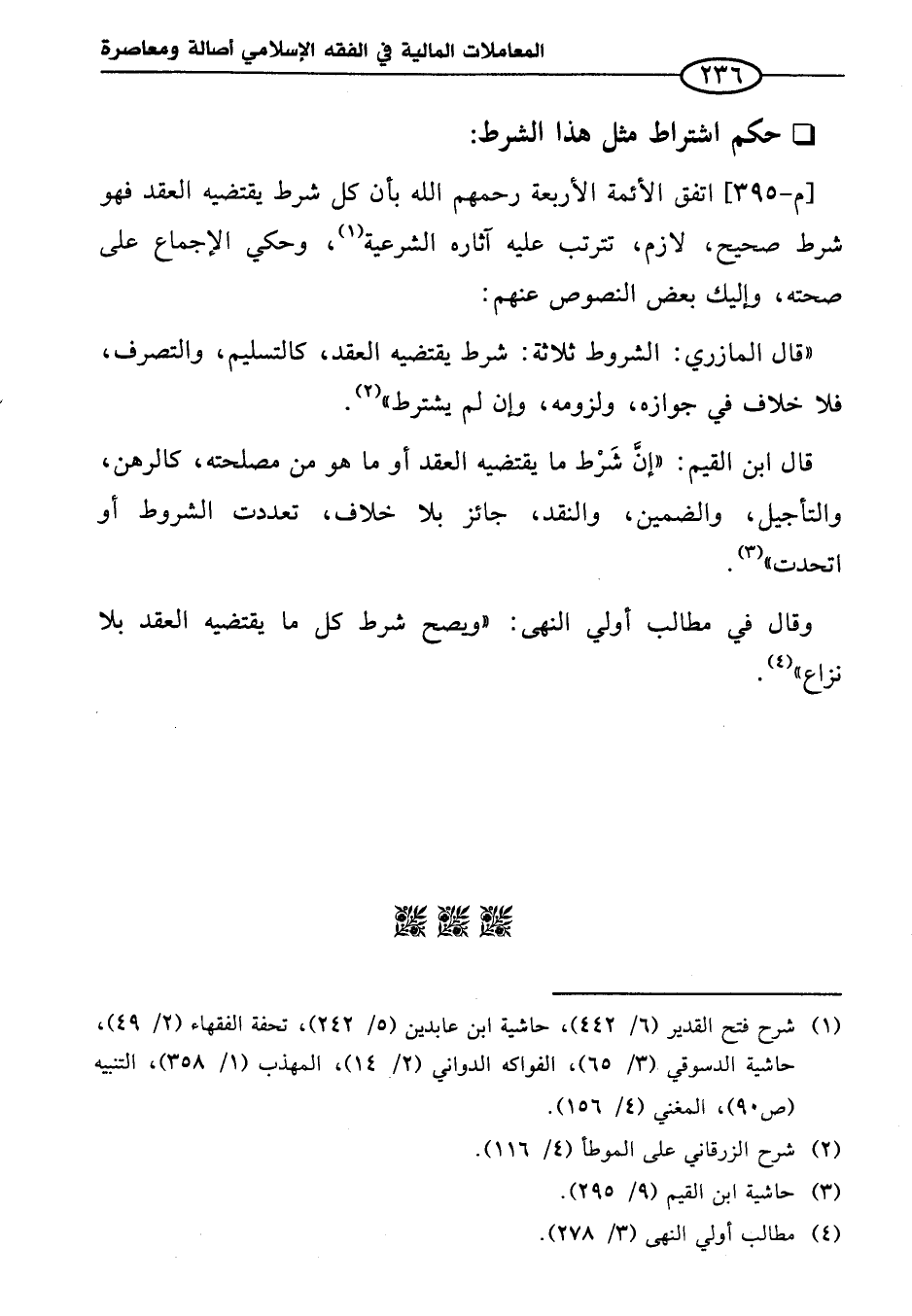 [م - ٣٩٥] اتفق الأئمة الأربعة رحمهم الله بأن كل شرط يقتضيه العقد فهو شرط صحيح، لازم، تترتب عليه آثاره الشرعية (¬١)، وحكي الإجماع على صحته، وإليك بعض النصوص عنهم: