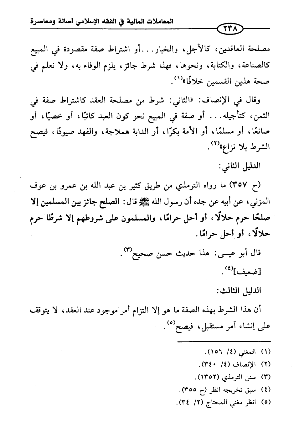 (ح-٣٥٧) ما رواه الترمذي من طريق كثير بن عبد الله بن عمرو بن عوف المزني، عن أبيه عن جده أن رسول الله - صلى الله عليه وسلم - قال: الصلح جائز بين المسلمين إلا صلحًا حرم حلالًا، أو أحل حرامًا، والمسلمون على شروطهم إلا شرطًا حرم حلالًا، أو أحل حرامًا.