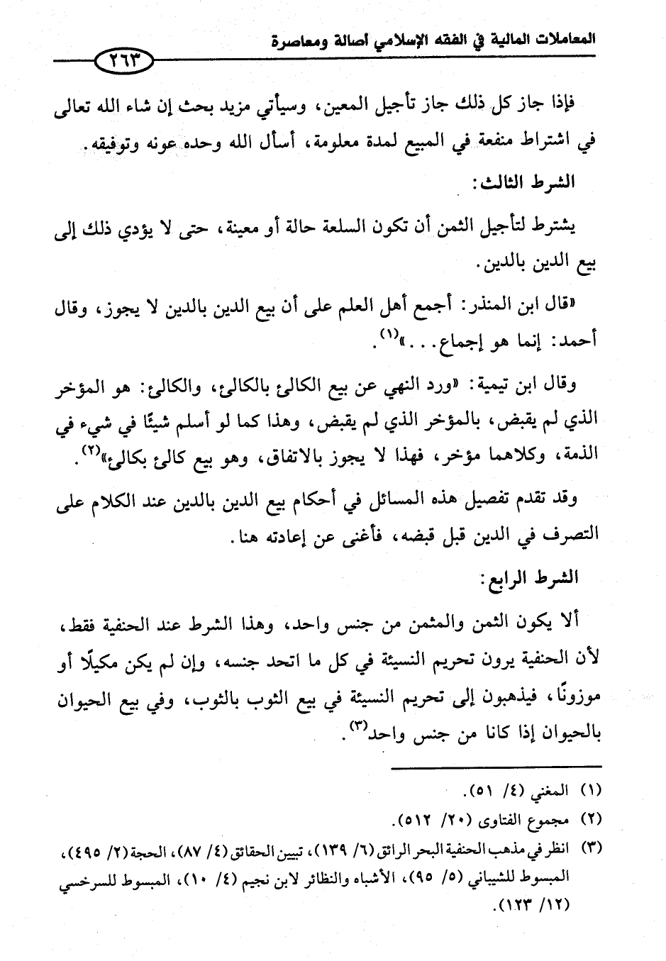 ألا يكون الثمن والمثمن من جنس واحد، وهذا الشرط عند الحنفية فقط، لأن الحنفية يرون تحريم النسيئة في كل ما اتحد جنسه، وإن لم يكن مكيلًا أو موزونًا، فيذهبون إلى تحريم النسيئة في بيع الثوب بالثوب، وفي بيع الحيوان بالحيوان إذا كانا من جنس واحد (¬٣).