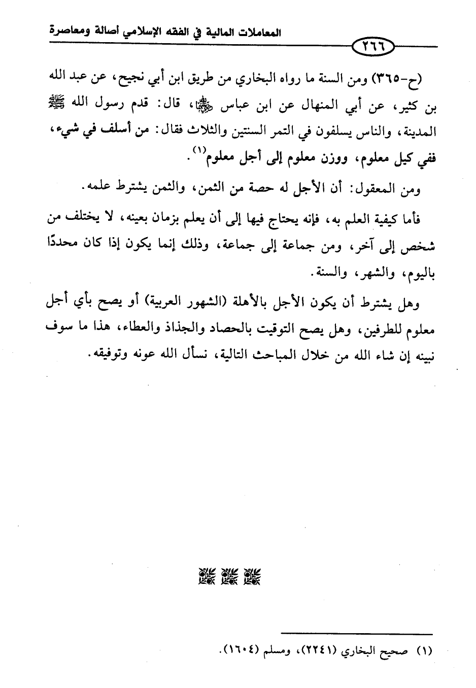 (ح-٣٦٥) ومن السنة ما رواه البخاري من طريق ابن أبي نجيح، عن عبد الله بن كثير، عن أبي المنهال عن ابن عباس - رضي الله عنهما -، قال: قدم رسول الله - صلى الله عليه وسلم - المدينة، والناس يسلفون في التمر السنتين والثلاث فقال: من أسلف في شيء، ففي كيل معلوم، ووزن معلوم إلى أجل معلوم (¬١).