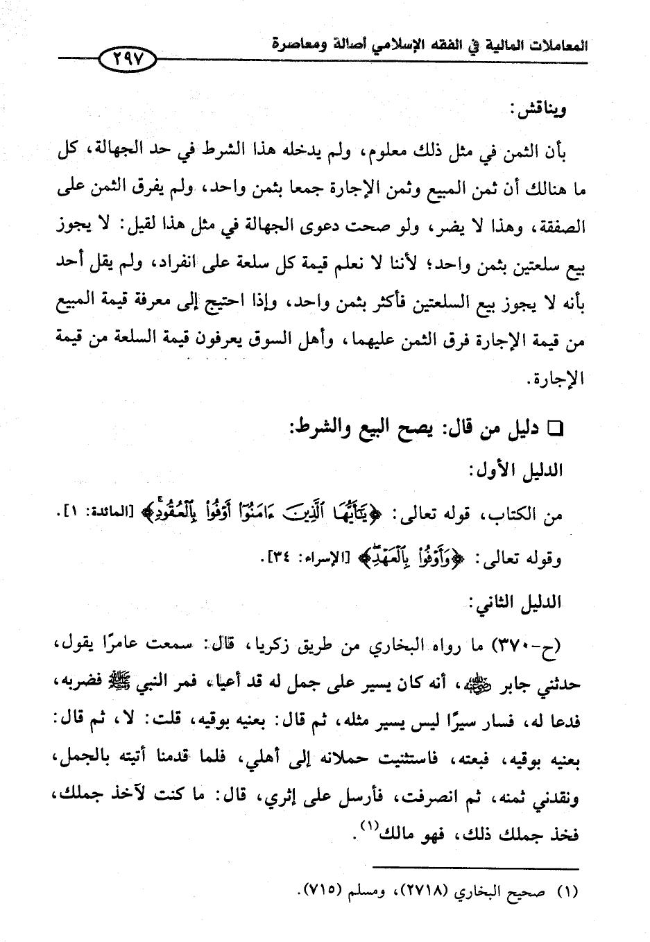 (ح-٣٧٠) ما رواه البخاري من طريق زكريا، قال: سمعت عامرًا يقول، حدثني جابر - رضي الله عنه -، أنه كان يسير على جمل له قد أعيا، فمر النبي - صلى الله عليه وسلم - فضربه، فدعا له، فسار سيرًا ليس يسير مثله، ثم قال: بعنيه بوقيه، قلت: لا، ثم قال: بعنيه بوقيه، فبعته، فاستثنيت حملانه إلى أهلي، فلما قدمنا أتيته بالجمل، ونقدني ثمنه، ثم انصرفت، فأرسل على إثري، قال: ما كنت لآخذ جملك، فخذ جملك ذلك، فهو مالك (¬١).