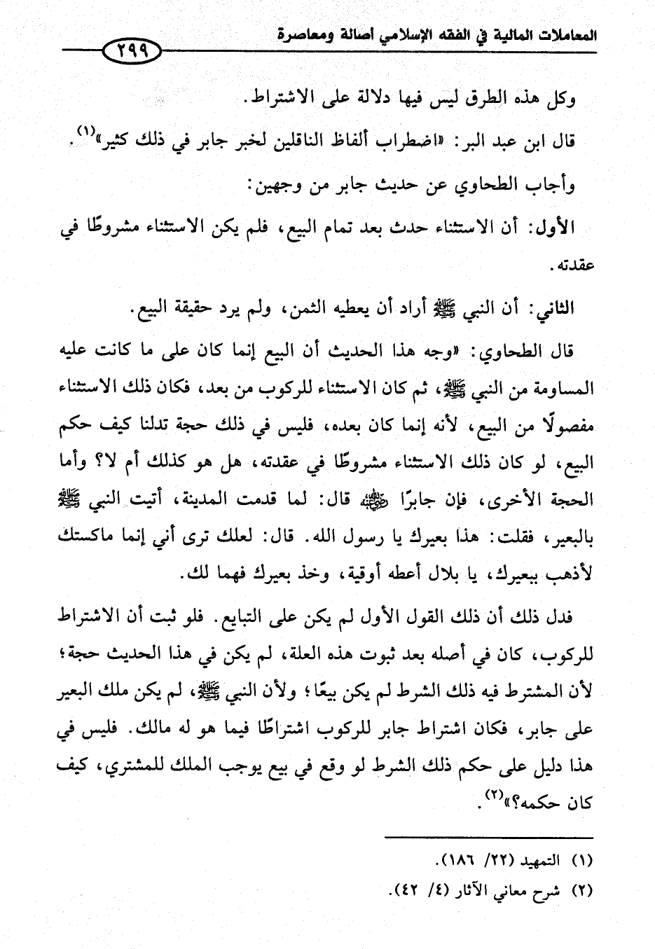 قال الطحاوي: "وجه هذا الحديث أن البيع إنما كان على ما كانت عليه المساومة من النبي - صلى الله عليه وسلم -، ثم كان الاستثناء للركوب من بعد، فكان ذلك الاستثناء مفصولًا من البيع، لأنه إنما كان بعده، فليس في ذلك حجة تدلنا كيف حكم البيع، لو كان ذلك الاستثناء مشروطًا في عقدته، هل هو كذلك أم لا؟ وأما الحجة الأخرى، فإن جابرًا - رضي الله عنه - قال: لما قدمت المدينة، أتيت النبي - صلى الله عليه وسلم - بالبعير، فقلت: هذا بعيرك يا رسول الله. قال: لعلك ترى أني إنما ماكستك لأذهب ببعيرك، يا بلال أعطه أوقية، وخذ بعيرك فهما لك.