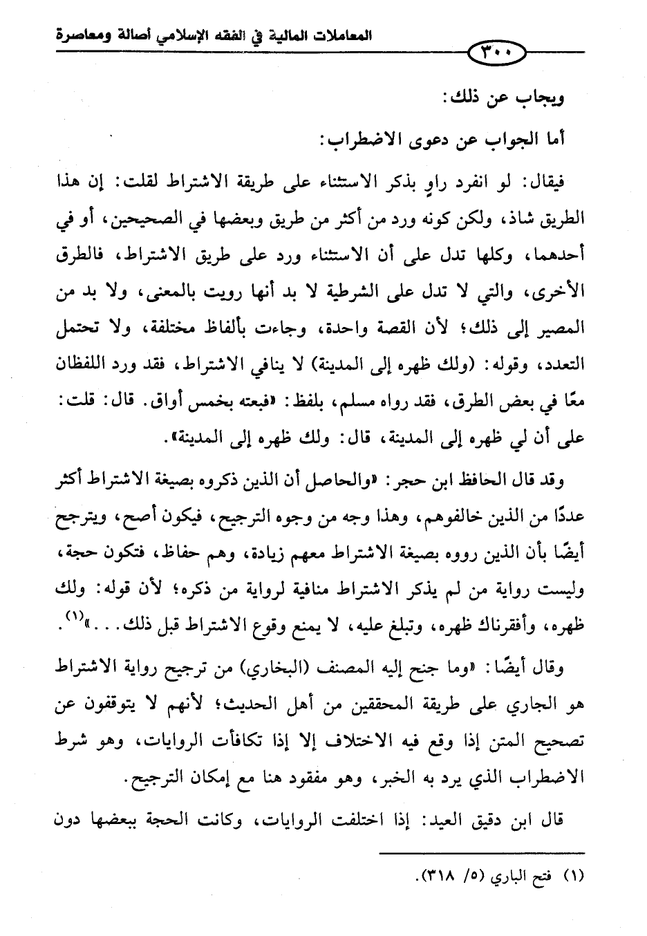 وقال أيضًا: "وما جنح إليه المصنف (البخاري) من ترجيح رواية الاشتراط هو البخاري على طريقة المحققين من أهل الحديث؛ لأنهم لا يتوقفون عن تصحيح المتن إذا وقع فيه الاختلاف إلا إذا تكافأت الروايات، وهو شرط الاضطراب الذي يرد به الخبر، وهو مفقود هنا مع إمكان الترجيح.