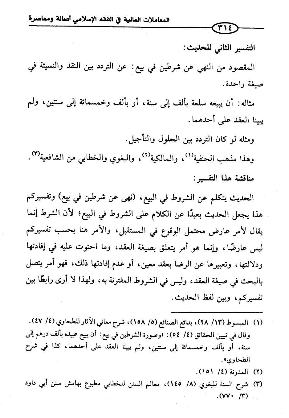 الحديث يتكلم عن الشروط في البيع، (نهى عن شرطين في بيع) وتفسيركم هذا يجعل الحديث بعيدًا عن الكلام على الشروط في البيع؛ لأن الشرط إنما يقال لأمر عارض محتمل الوقوع في المستقبل، والأمر هنا بحسب تفسيركم ليس عارضًا، وإنما هو أمر يتعلق بصيغة العقد، وما احتوت عليه في إفادتها ودلالتها، وتعبيرها عن الرضا بعقد معين، أو عدم إفادتها ذلك، فهو أمر يتصل بالبحث في صيغة العقد، وليس في الشروط المقترنة به، ولهذا لا أرى رابطًا بين تفسيركم، وبين لفظ الحديث.