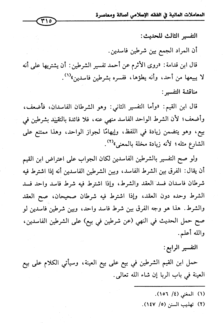 ولو صح التفسير بالشرطين الفاسدين لكان الجواب على اعتراض ابن القيم أن يقال: الفرق بين الشرط الفاسد، وبين الشرطين الفاسدين أنه إذا اشترط فيه شرطان فاسدان فسد العقد والشرط، وإذا اشترط فيه شرط فاسد واحد فسد الشرط وحده دون العقد، وإذا اشترط فيه شرطان صحيحان، صح العقد والشرط. هذا هو وجه الفرق بين شرط فاسد واحد، وبين شرطين فاسدين لو صح حمل الحديث في النهي (عن شرطين في بيع) على الشرطين الفاسدين، والله أعلم.