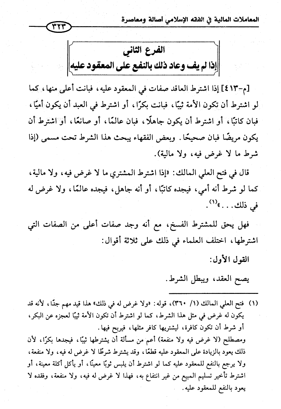 (¬١) فتح العلي المالك (١/ ٣٦٠)، قوله: "ولا غرض له في ذلك" هذا قيد مهم جدًا، لأنه قد يكون له غرض في مثل هذا الشرط، كما لو اشترط أن تكون الأمة ثيبًا لعجزه عن البكر، أو شرط أن تكون كافرة، ليشتريها كافر مثلها، فيربح فيها.