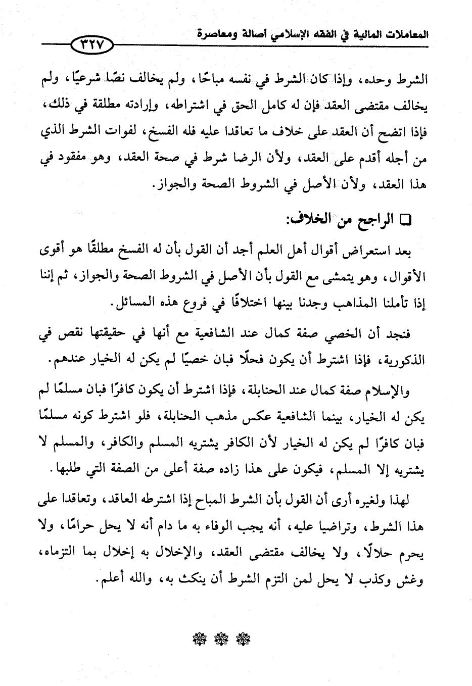 لهذا ولغيره أرى أن القول بأن الشرط المباح إذا اشترطه العاقد، وتعاقدا على هذا الشرط، وتراضيا عليه، أنه يجب الوفاء به ما دام أنه لا يحل حرامًا، ولا يحرم حلالًا، ولا يخالف مقتضى العقد، والإخلال به إخلال بما التزماه، وغش وكذب لا يحل لمن التزم الشرط أن ينكث به، والله أعلم.