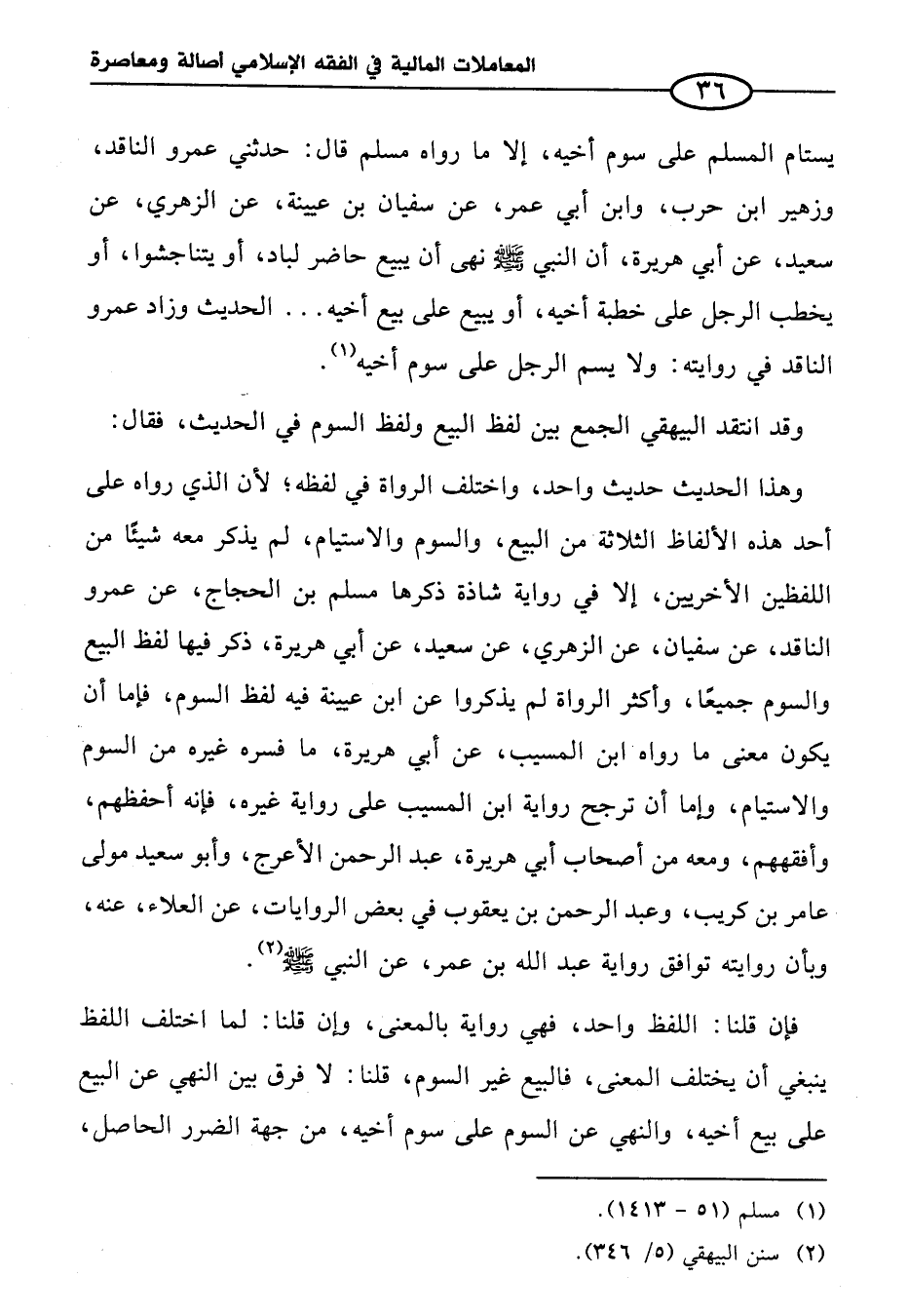 وقد انتقد البيهقي الجمع بين لفظ البيع ولفظ السوم في الحديث، فقال: وهذا الحديث حديث واحد، واختلف الرواة في لفظه؛ لأن الذي رواه على أحد هذه الألفاظ الثلاثة من البيع، والسوم والاستيام، لم يذكر معه شيئاً من اللفظين الأخريين، إلا في رواية شاذة ذكرها مسلم بن الحجاج، عن عمرو الناقد، عن سفيان، عن الزهري، عن سعيد، عن أبي هريرة، ذكر فيها لفظ البيع والسوم جميعًا، وأكثر الرواة لم يذكروا عن ابن عيينة فيه لفظ السوم، فإما أن يكون معنى ما رواه ابن المسيب، عن أبي هريرة، ما فسره غيره من السوم والاستيام، وإما أن ترجح رواية ابن المسيب على رواية غيره، فإنه أحفظهم، وأفقههم، ومعه من أصحاب أبي هريرة، عبد الرحمن الأعرج، وأبو سعيد مولى عامر بن كريب، وعبد الرحمن بن يعقوب في بعض الروايات، عن العلاء، عنه، وبأن روايته توافق رواية عبد الله بن عمر، عن النبي - صلى الله عليه وسلم - (¬٢).