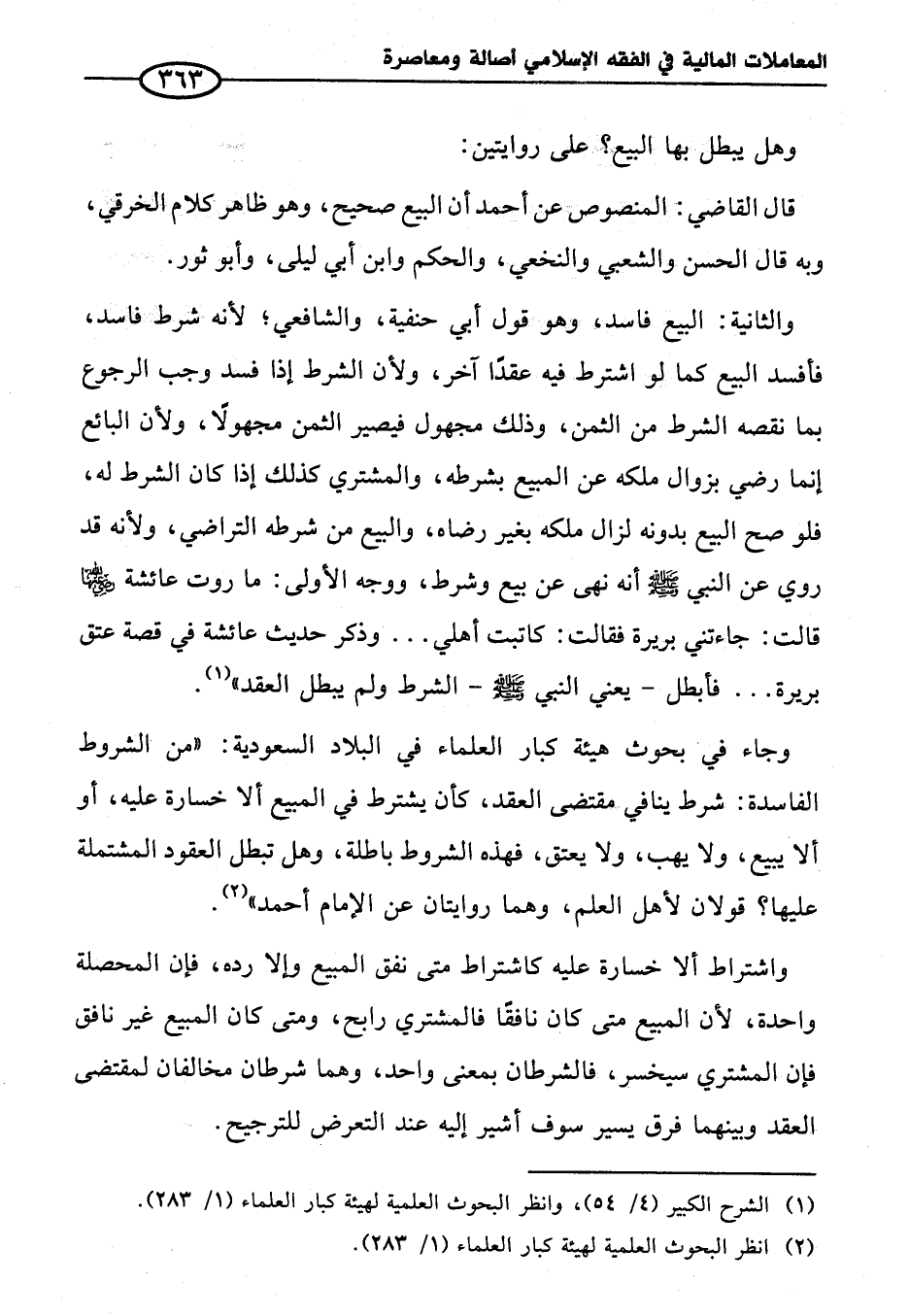 وجاء في بحوث هيئة كبار العلماء في البلاد السعودية: "من الشروط الفاسدة: شرط ينافي مقتضى العقد، كأن يشترط في المبيع ألا خسارة عليه، أو ألا يبيع، ولا يهب، ولا يعتق، فهذه الشروط باطلة، وهل تبطل العقود المشتملة عليها؟ قولان لأهل العلم، وهما روايتان عن الإمام أحمد" (¬٢).