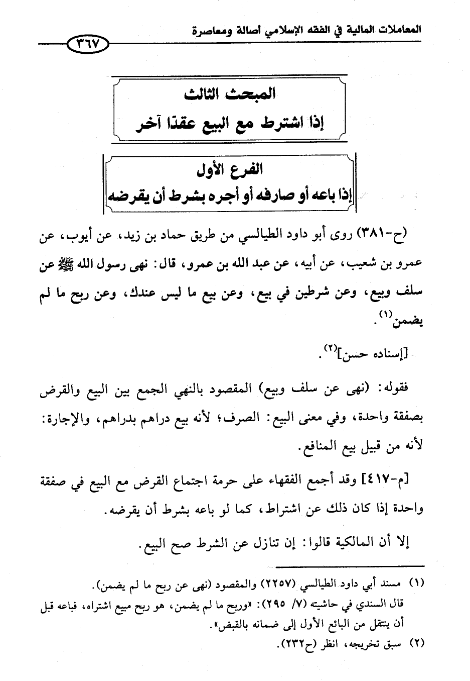 (ح-٣٨١) روى أبو داود الطيالسي من طريق حماد بن زيد، عن أيوب، عن عمرو بن شعيب، عن أبيه، عن عبد الله بن عمرو، قال: نهى رسول الله - صلى الله عليه وسلم - عن سلف وبيع، وعن شرطين في بيع، وعن بيع ما ليس عندك، وعن ربح ما لم يضمن (¬١).