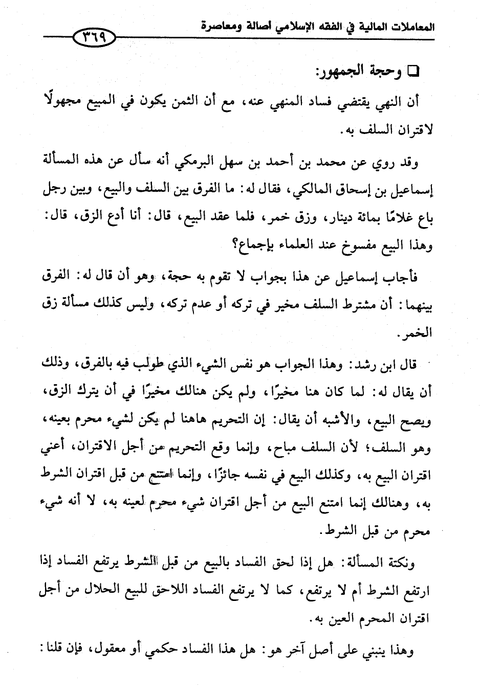 وقد روي عن محمَّد بن أحمد بن سهل البرمكي أنه سأل عن هذه المسألة إسماعيل بن إسحاق المالكي، فقال له: ما الفرق بين السلف والبيع، وبين رجل باع غلامًا بمائة دينار، وزق خمر، فلما عقد البيع، قال: أنا أدع الزق، قال: وهذا البيع مفسوخ عند العلماء بإجماع؟