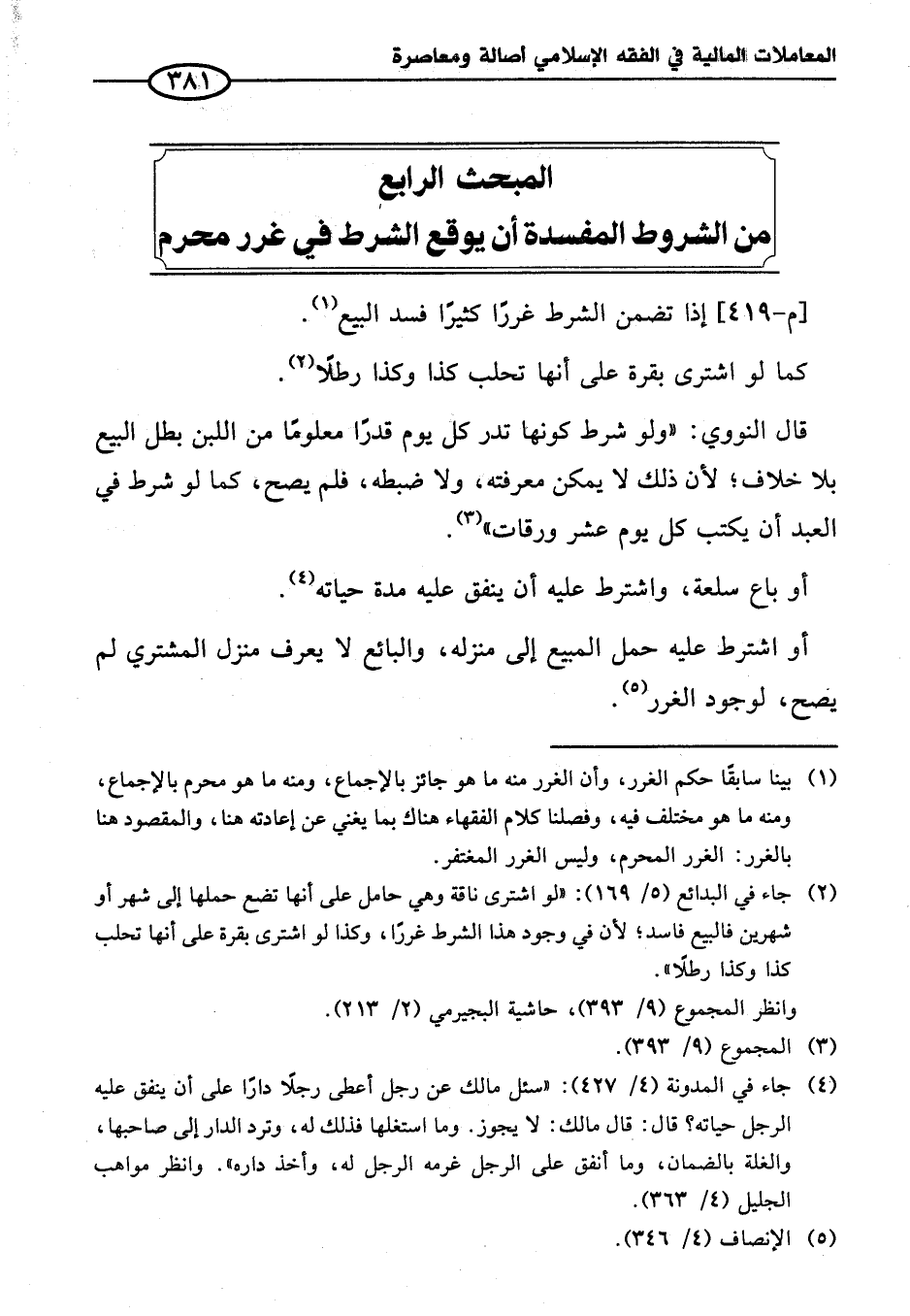 المبحث الرابع من الشروط المفسدة أن يوقع الشرط في غرر محرم