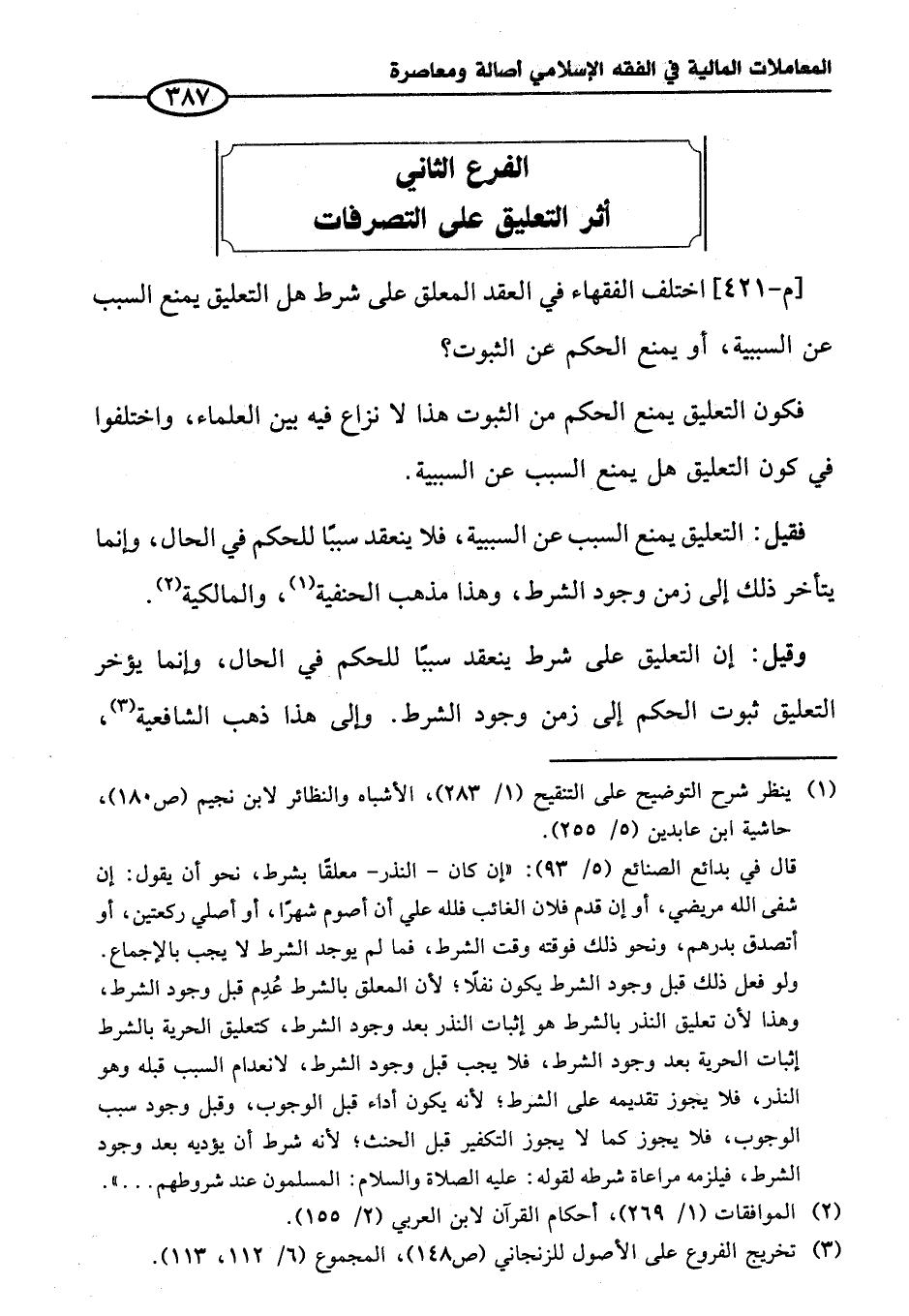 [م - ٤٢١] اختلف الفقهاء في العقد المعلق على شرط هل التعليق يمنع السبب عن السببية، أو يمنع الحكم عن الثبوت؟