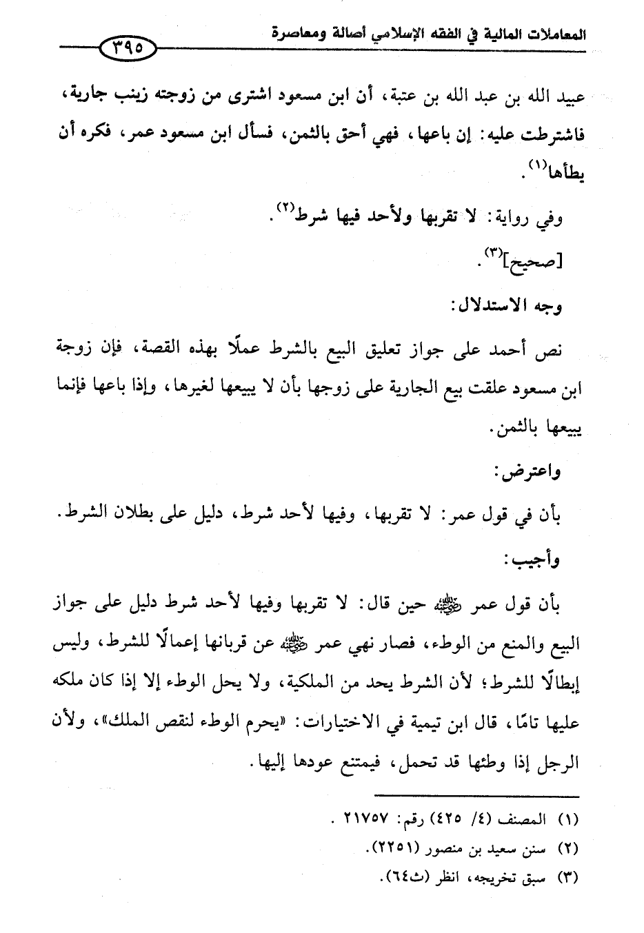 عبيد الله بن عبد الله بن عتبة، أن ابن مسعود اشترى من زوجته زينب جارية، فاشترطت عليه: إن باعها، فهي أحق بالثمن، فسأل ابن مسعود عمر، فكره أن يطأها (¬١).